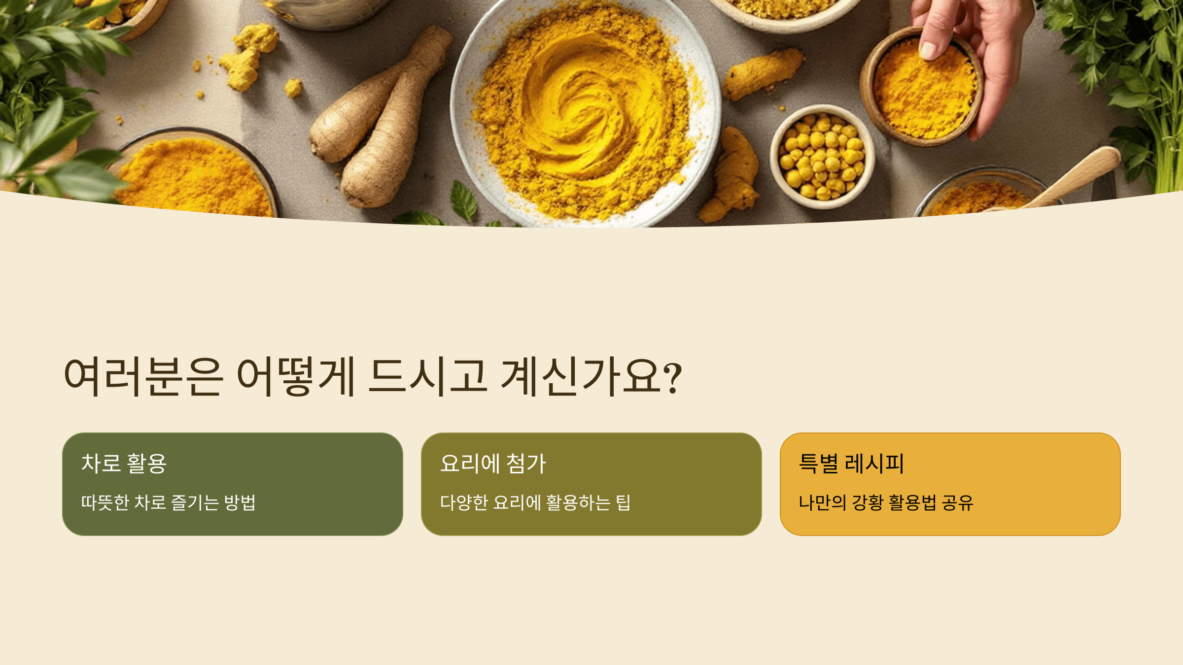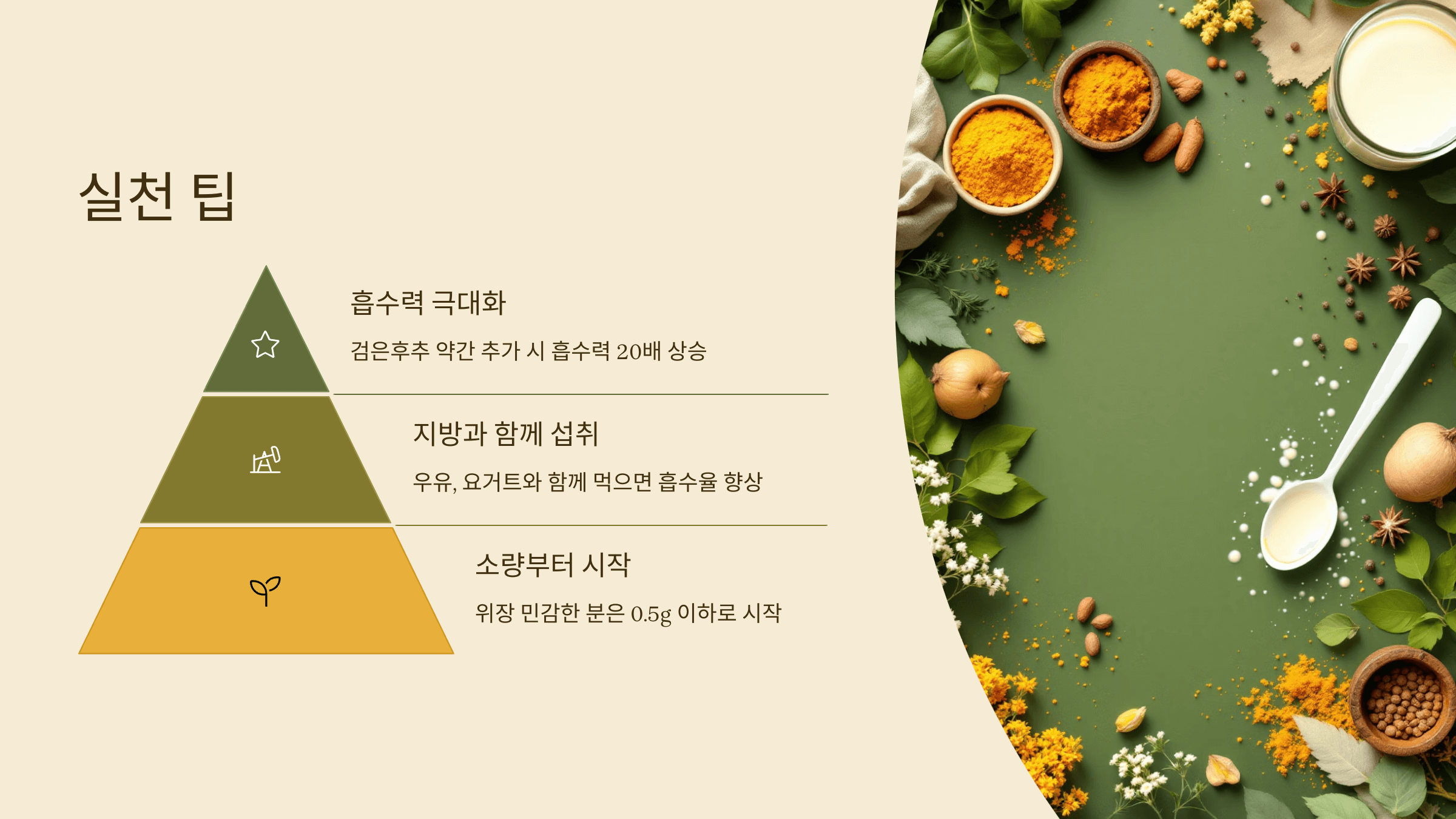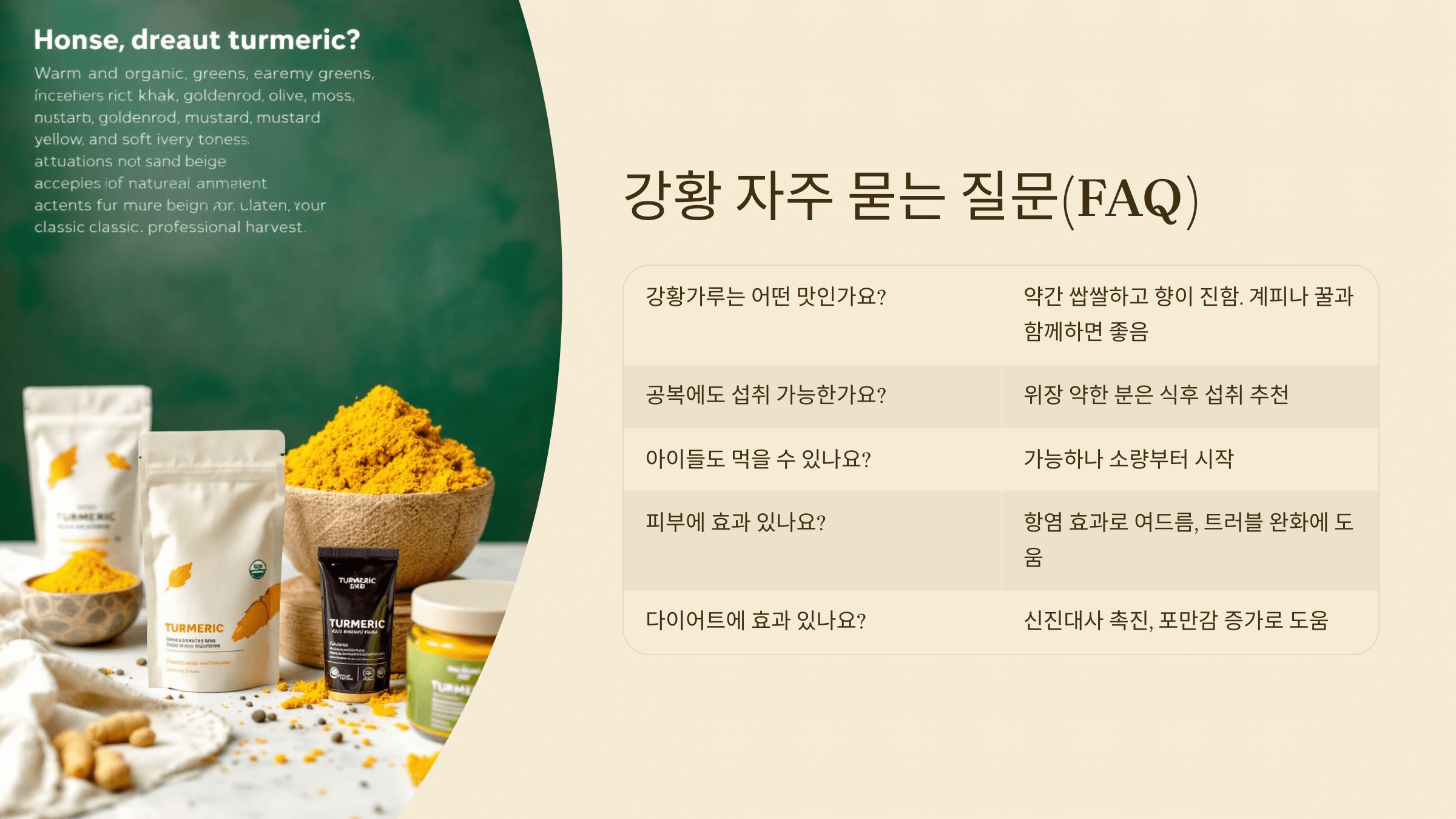 - 강황가루는 지방과 함께 섭취 시 흡수율이 높아져요 (예: 우유, 요거트).