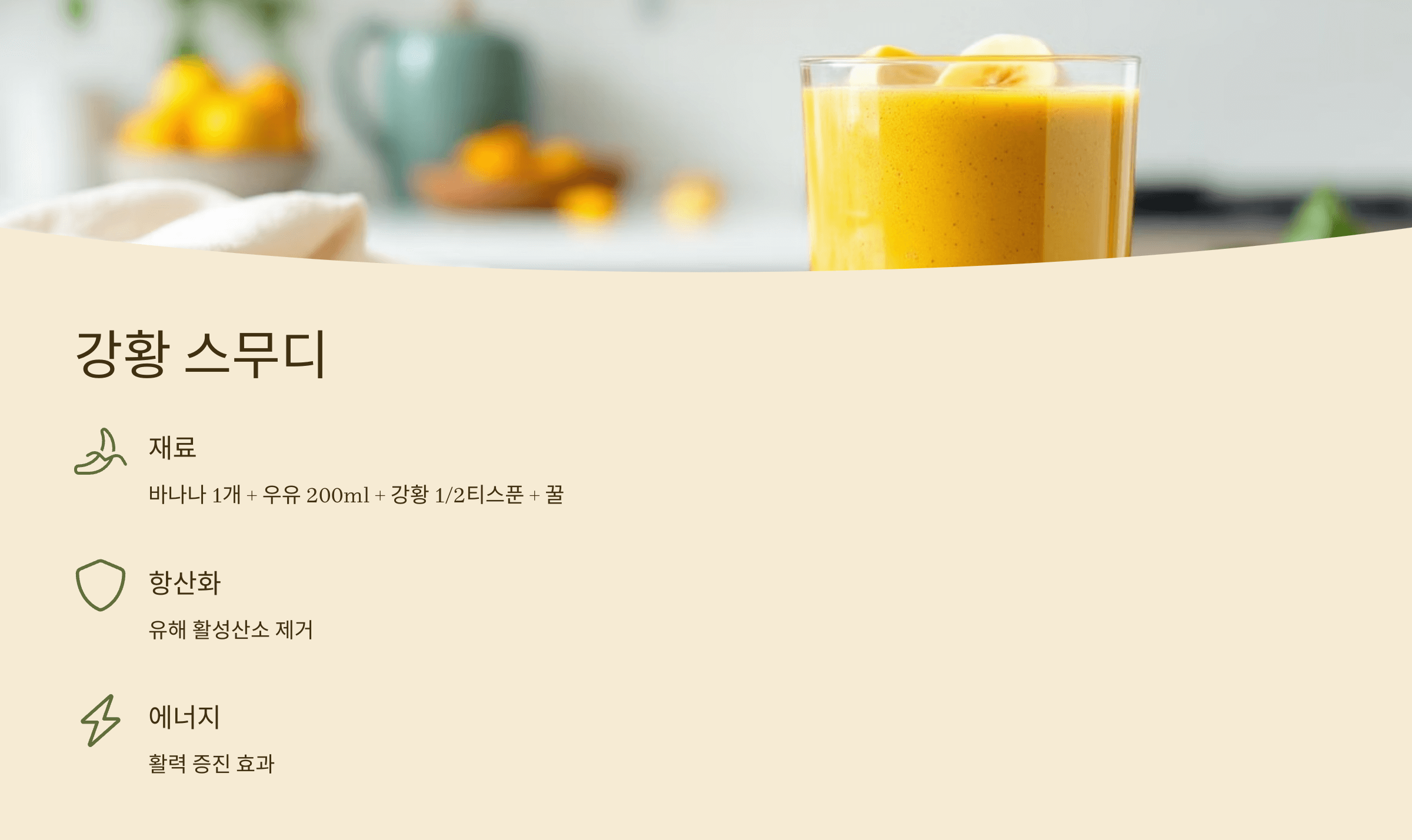 - 스무디 – 바나나+우유+강황가루 약간으로 건강 스무디 완성