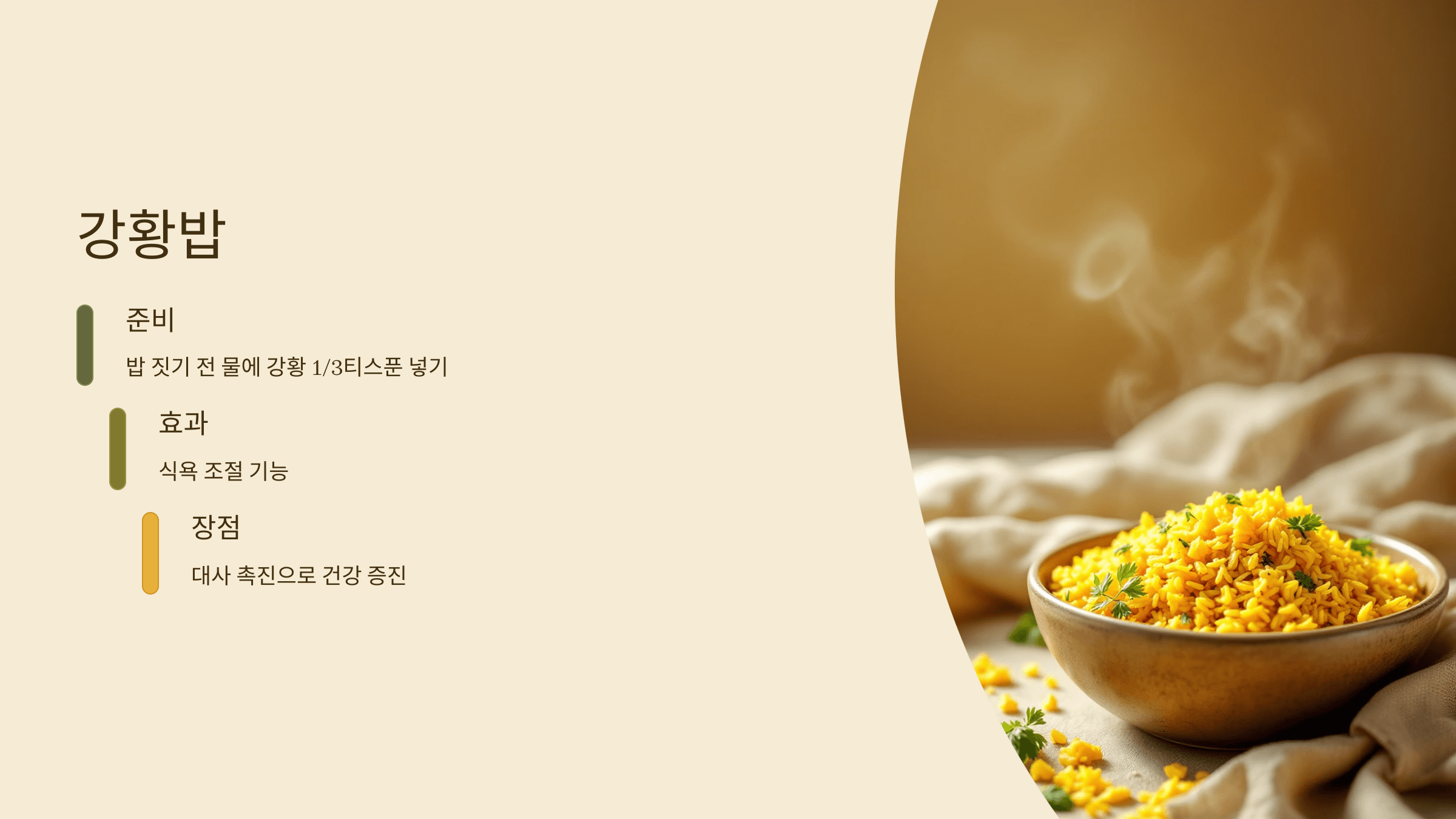 - 강황밥 – 밥 지을 때 강황 0.5g 정도 넣으면 색도 곱고 건강에도 좋아요
