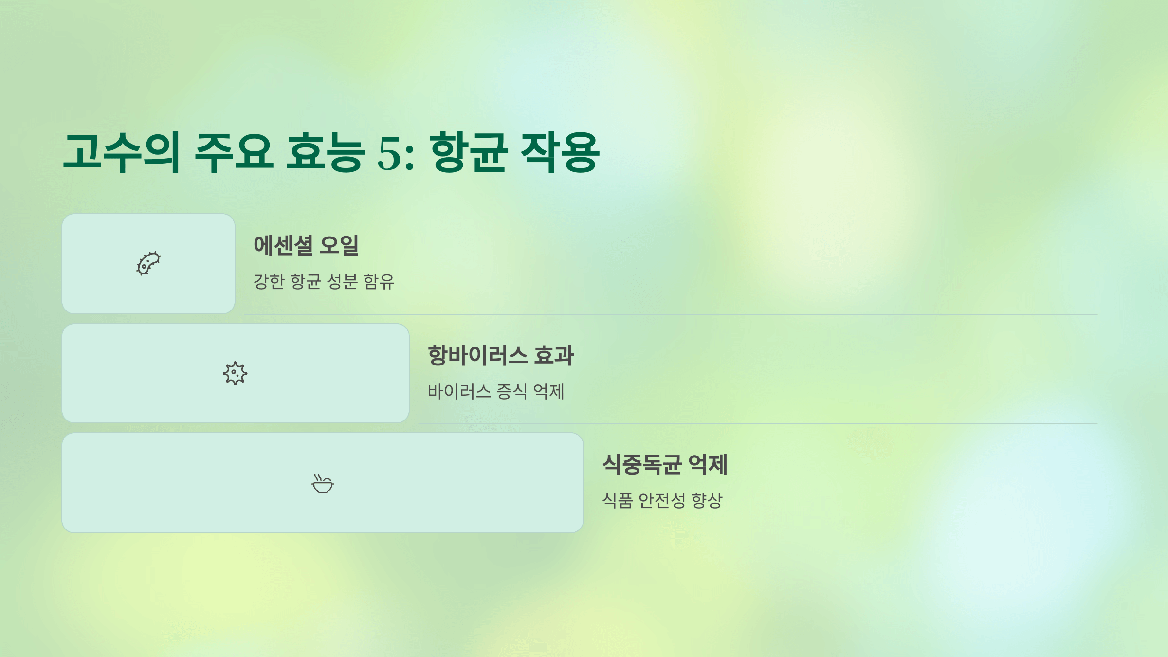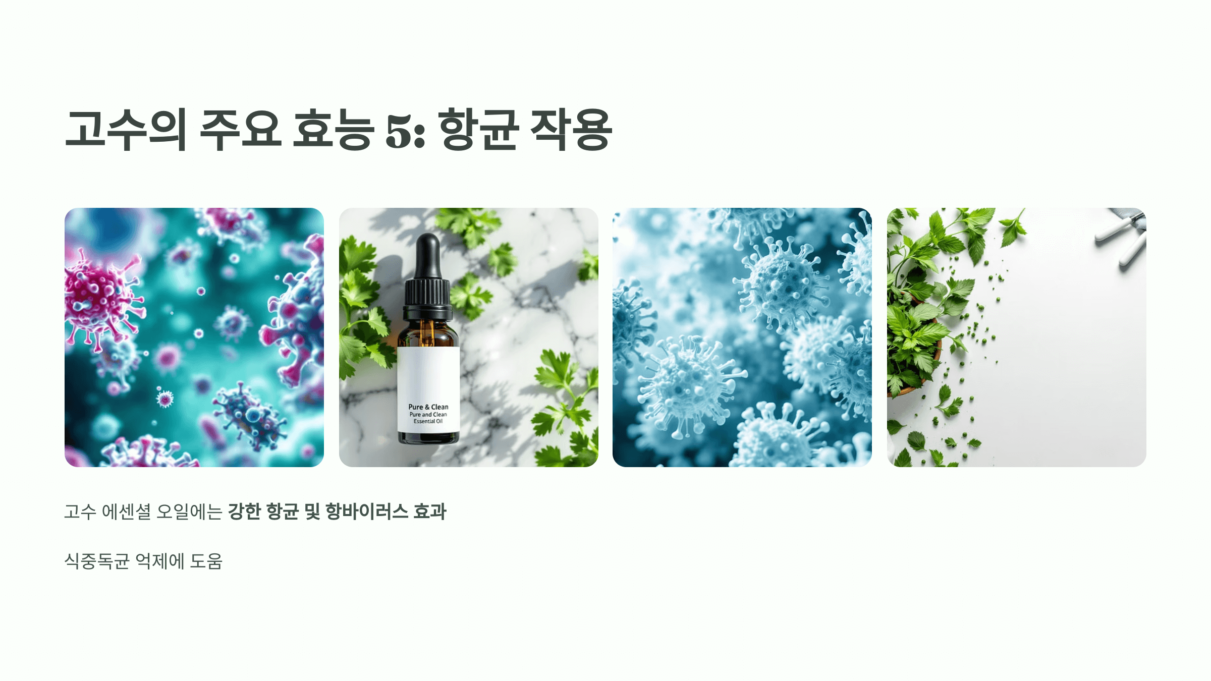 고수의 에센셜 오일에는 강한 항균 및 항바이러스 효과가 있어 식중독균 억제에도 도움이 됩니다.