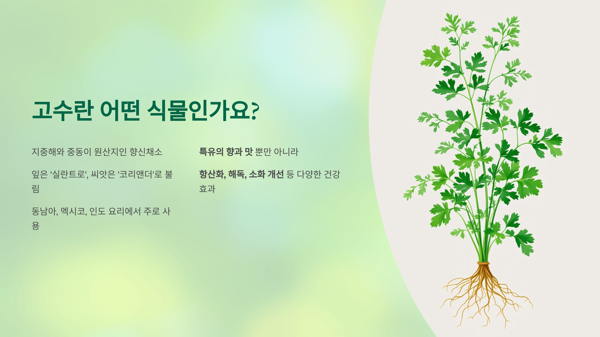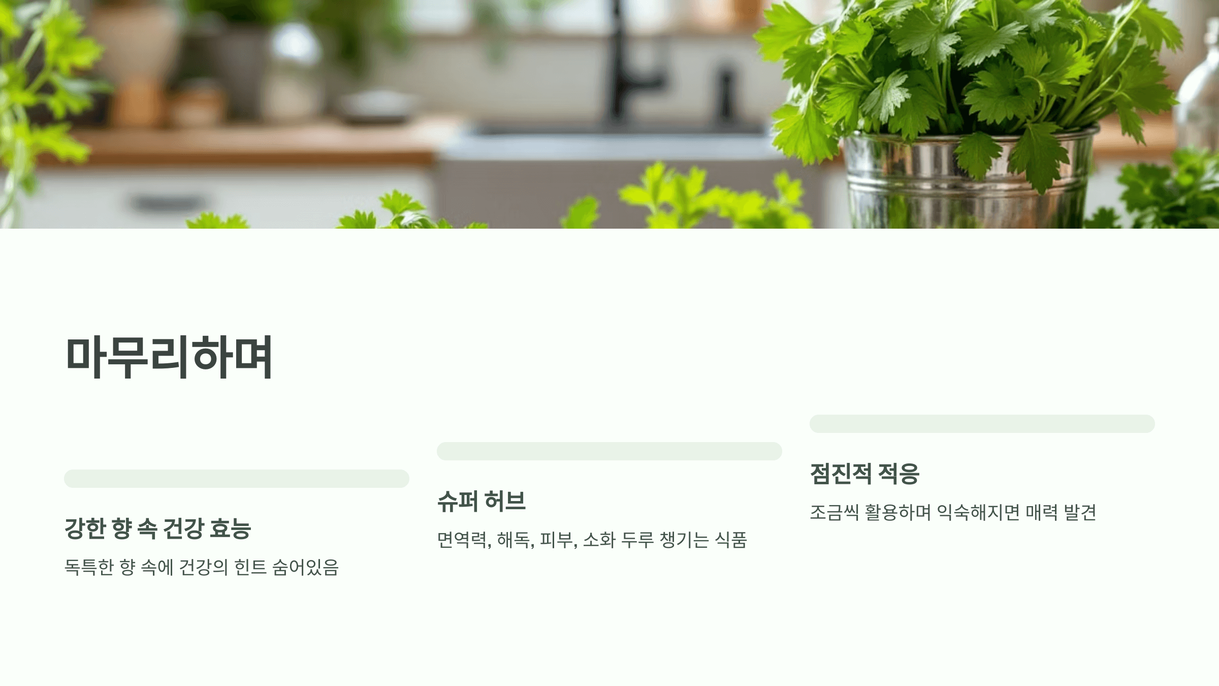 고수는 향이 강하지만, 그 향 속에 건강의 힌트가 숨어 있어요.