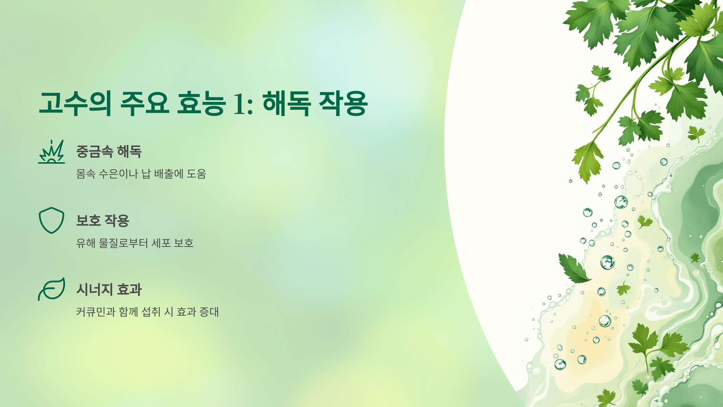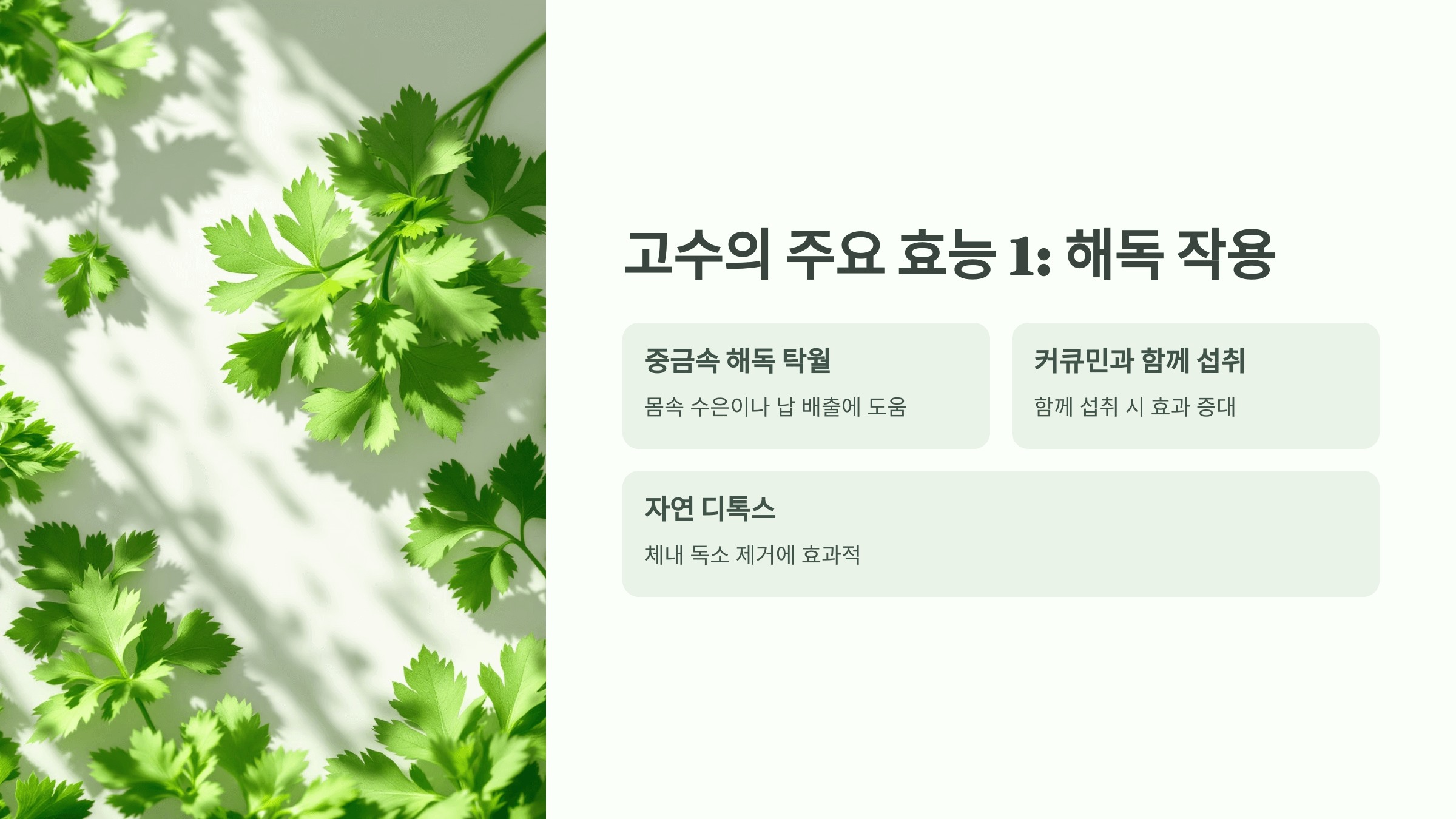고수는 중금속 해독 작용이 탁월해서, 몸속 수은이나 납을 배출하는 데 도움을 줘요.