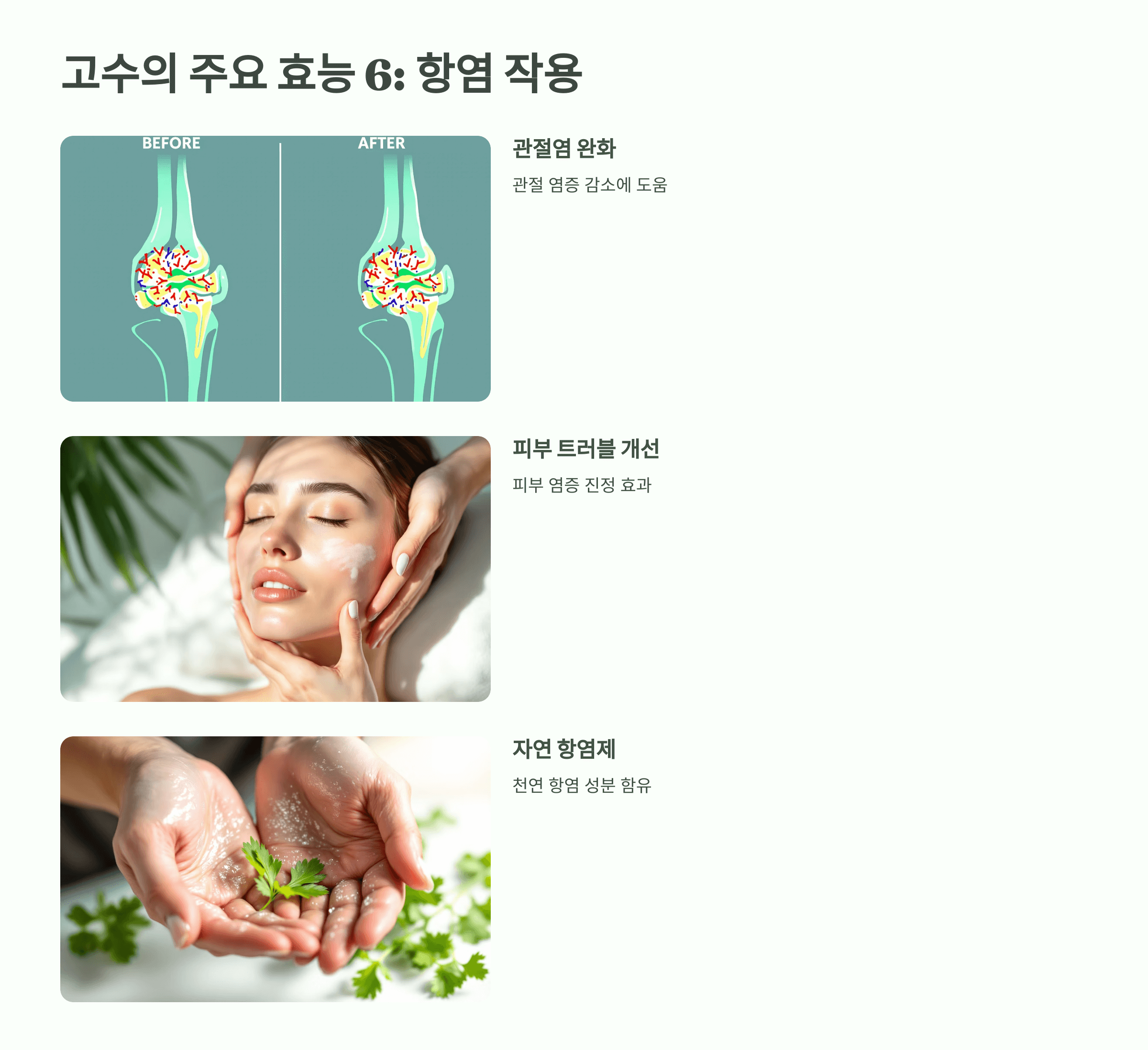 고수는 관절염이나 피부 트러블처럼 염증성 질환 완화에 좋은 식품이에요.