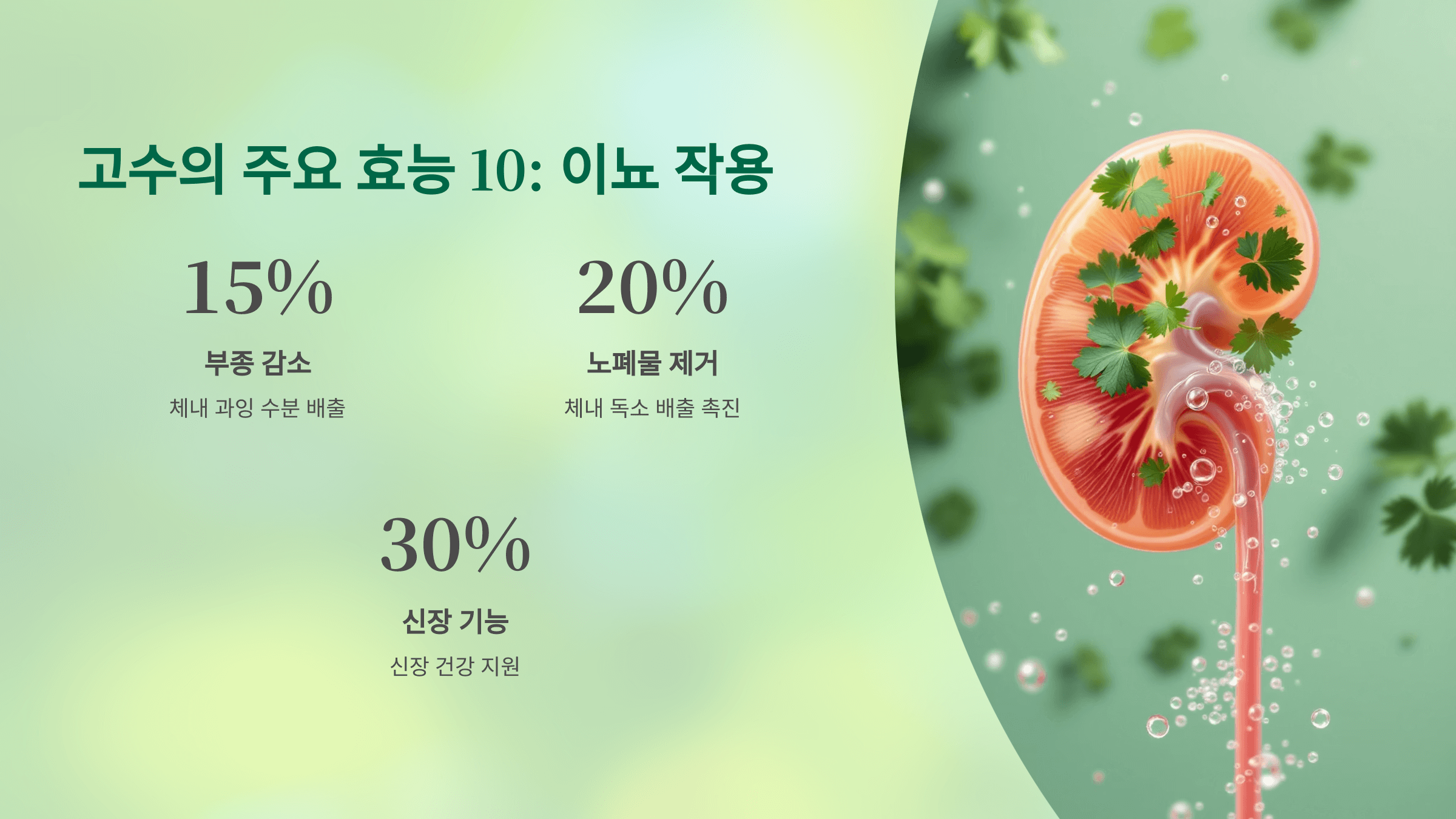 고수는 체내 노폐물 배출을 돕는 이뇨 작용이 있어 부종 완화에도 도움이 됩니다.