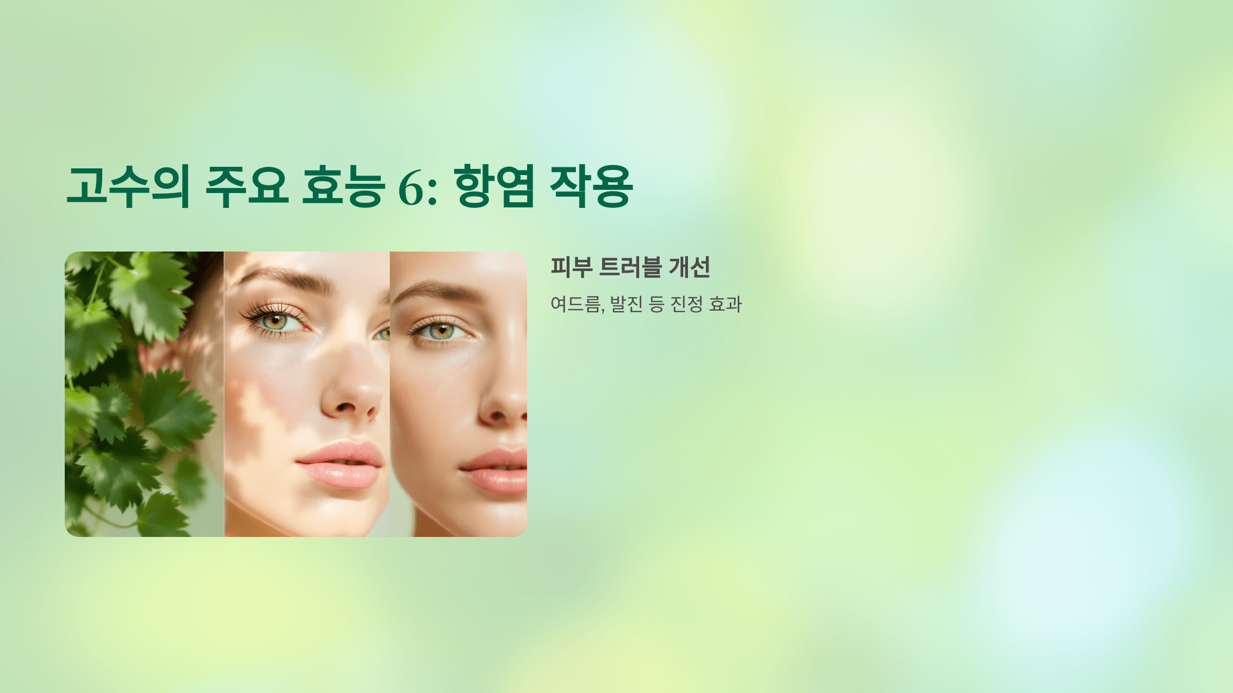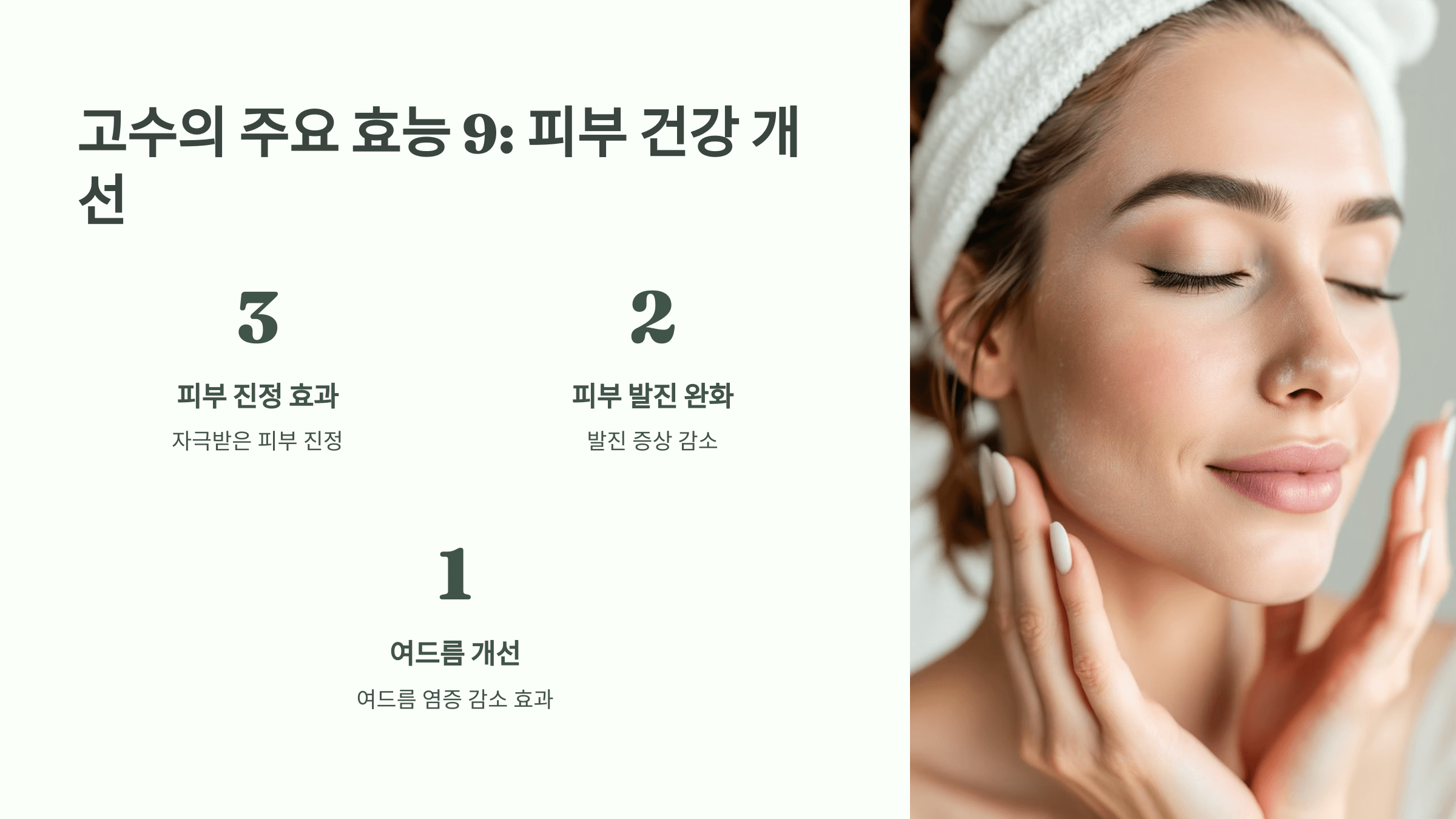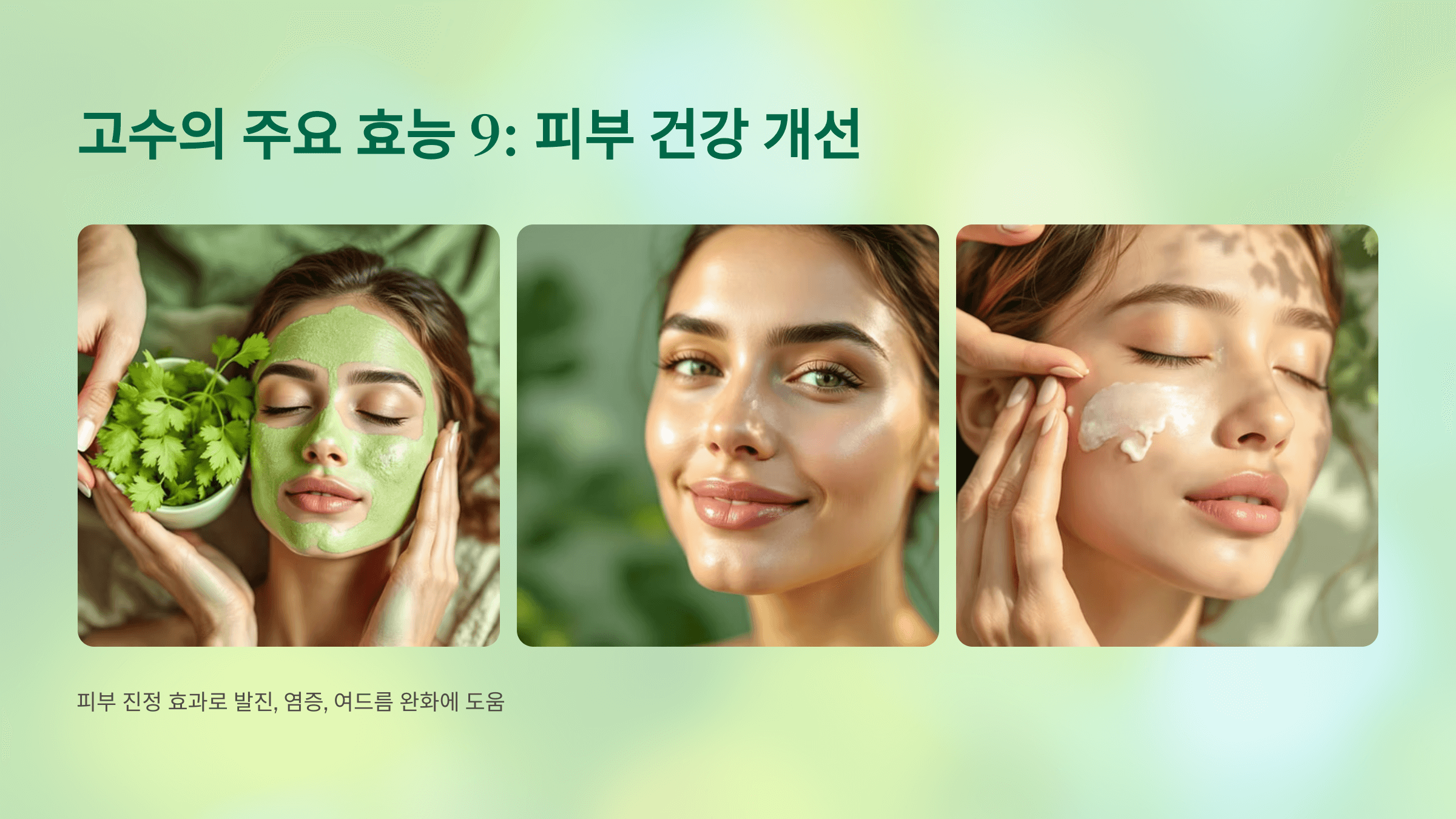 고수는 피부 진정 효과도 있어요. 특히 피부 발진, 염증, 여드름 완화에 도움을 줄 수 있어요.