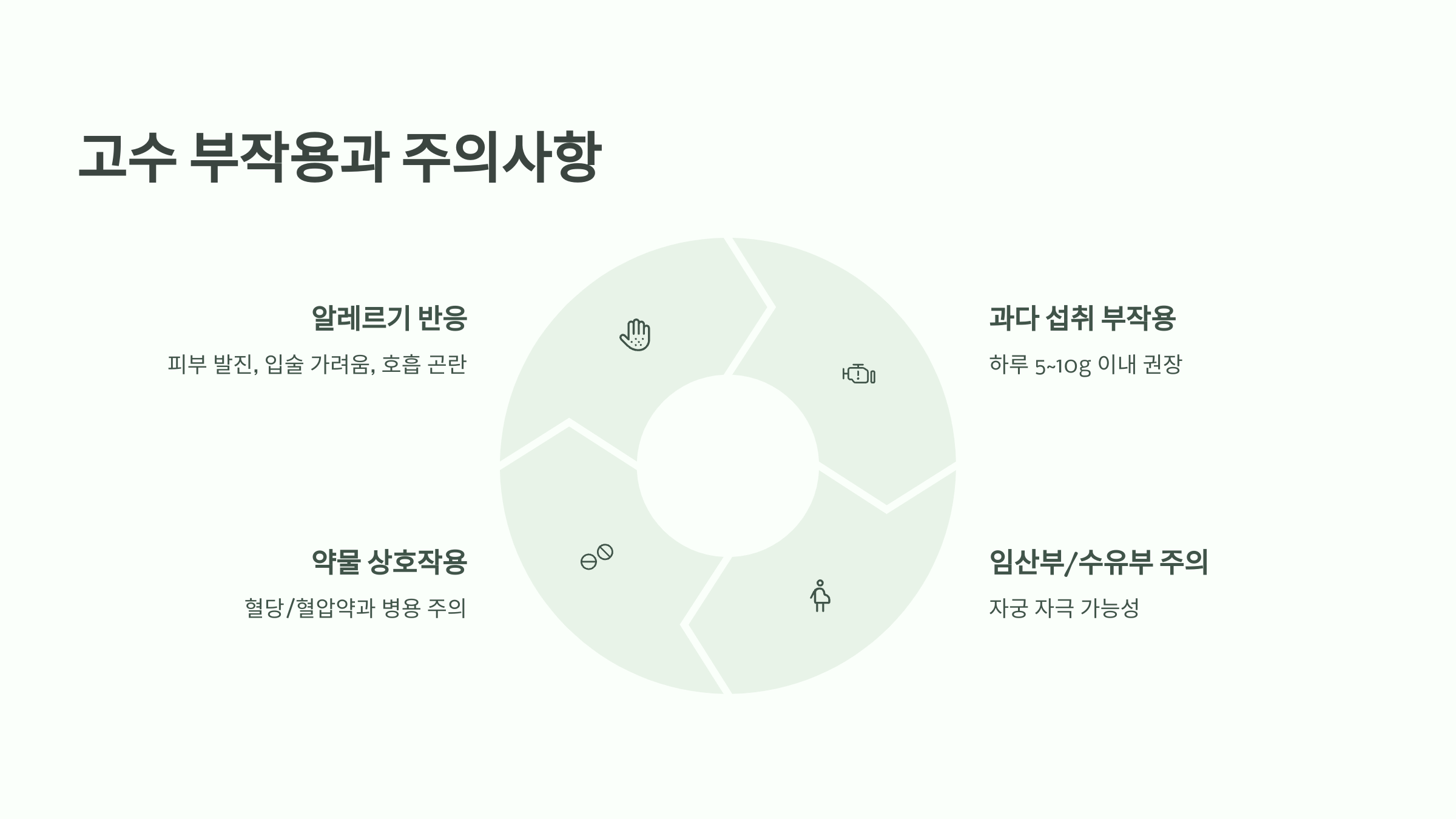 당뇨약이나 혈압약과 병용 시 작용이 과해질 수 있습니다. - 약을 복용 중이라면 전문가 상담 후 섭취하세요.