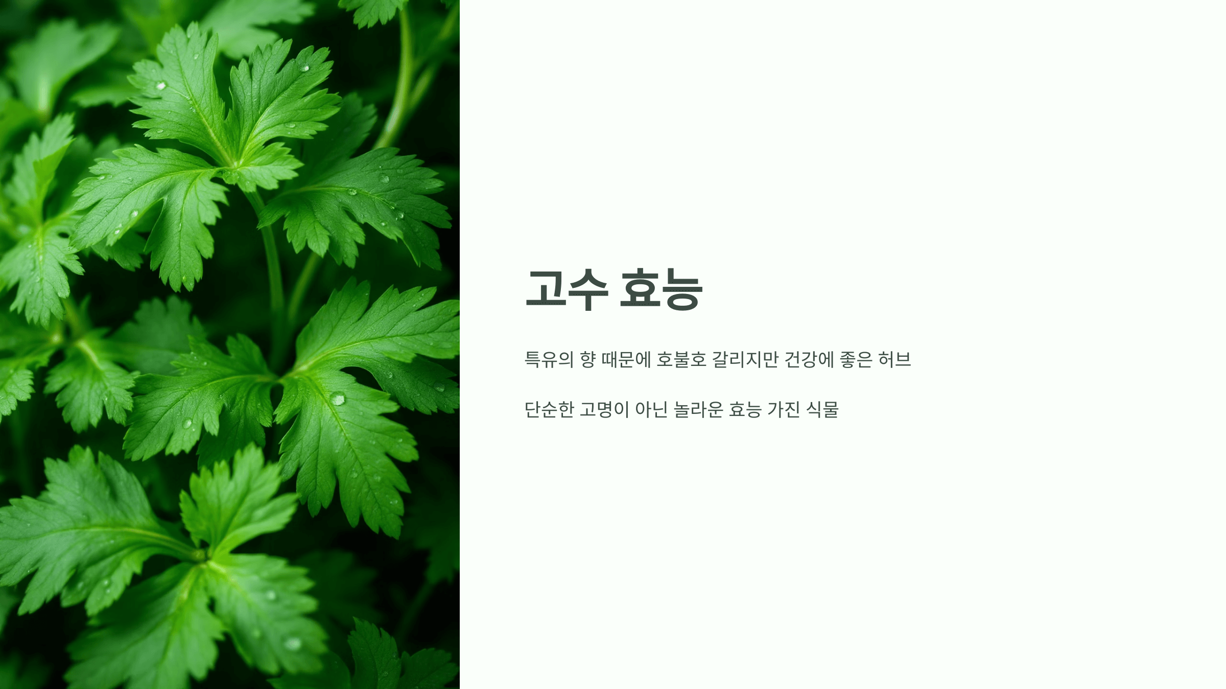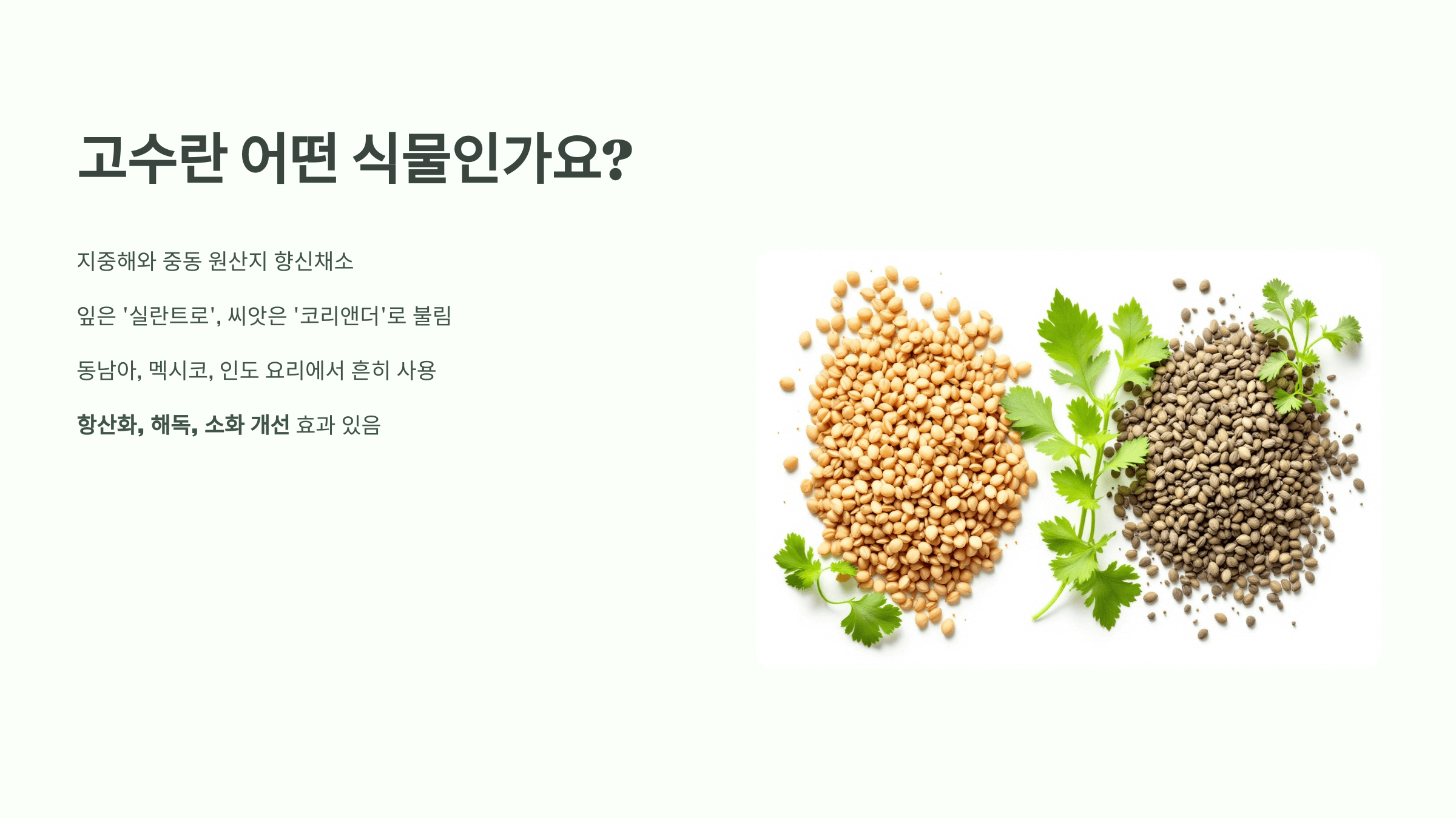 하지만 고수는 단순히 향이 강한 채소가 아니라, 항산화, 해독, 소화 개선 등 다양한 건강 효과를 가진 식물이랍니다.
