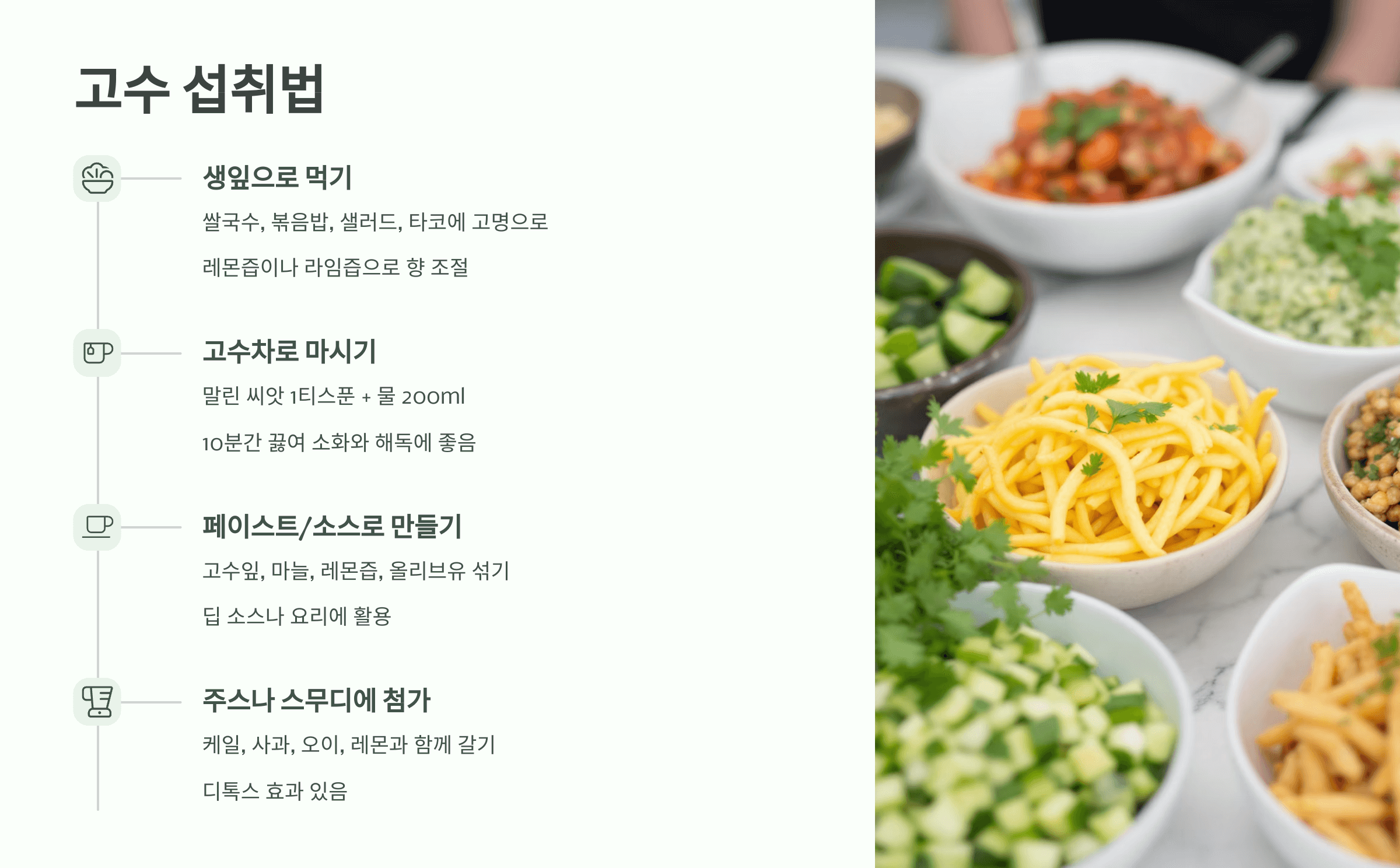 처음엔 어렵게 느껴질 수 있지만, 요리에 조금씩 활용하면서 익숙해지면 고수의 매력에 푹 빠질 수 있어요.