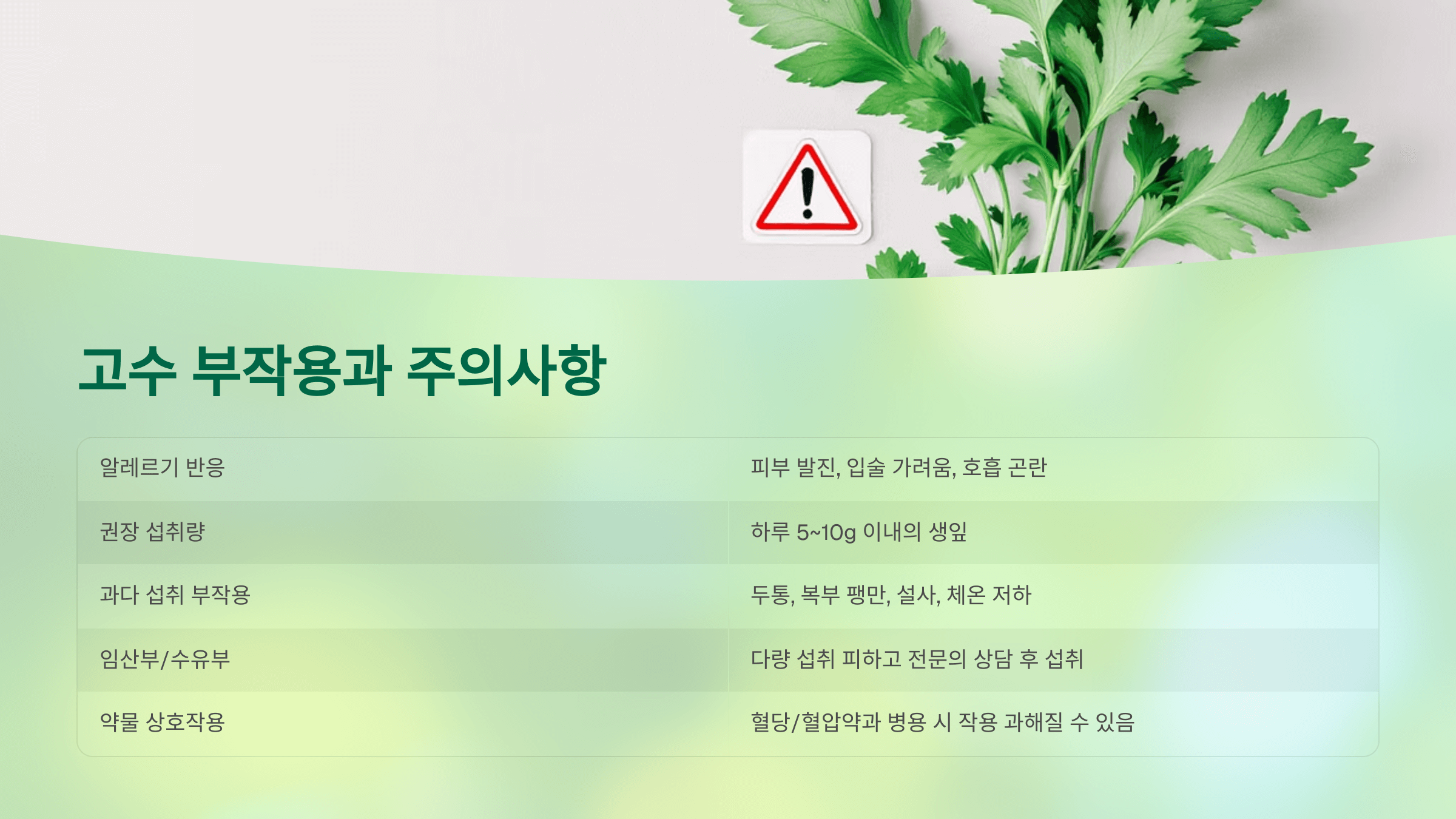 - 고수는 자궁을 자극할 수 있다는 보고가 있어 임산부는 다량 섭취를 피하고,