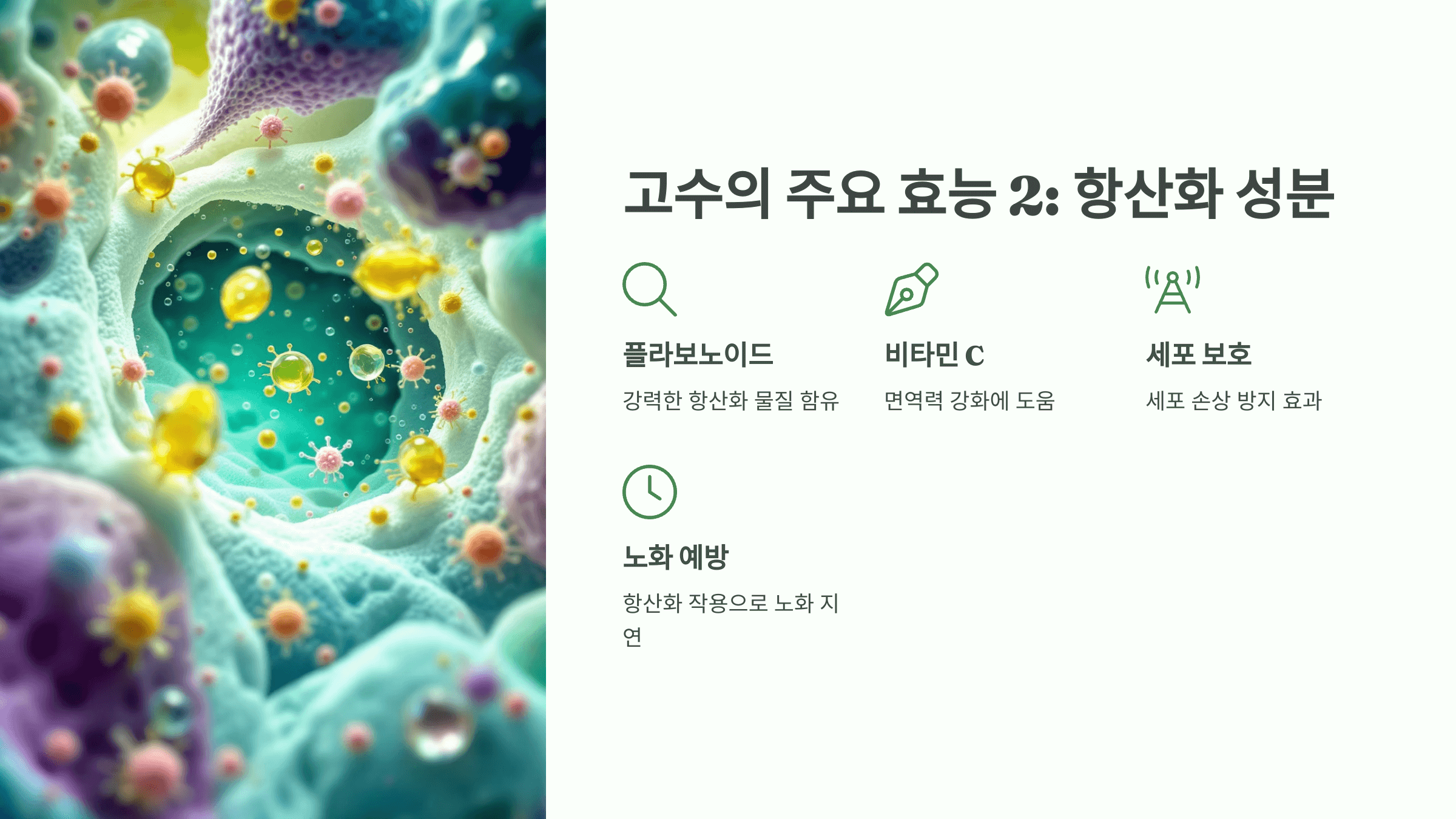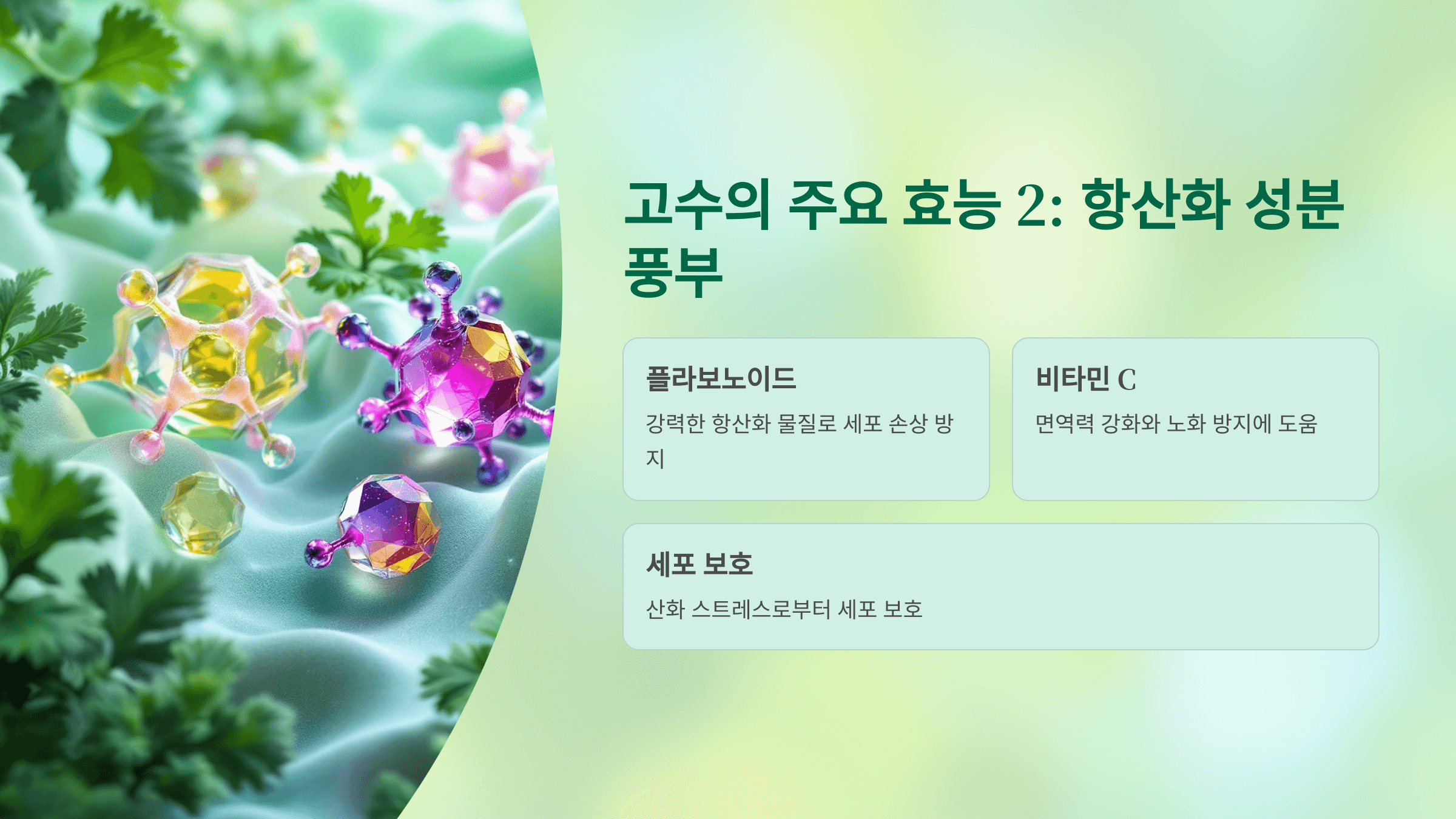 고수에는 플라보노이드와 비타민 C 같은 항산화 성분이 많아 세포 손상을 방지하고, 노화 예방에 도움을 줍니다.