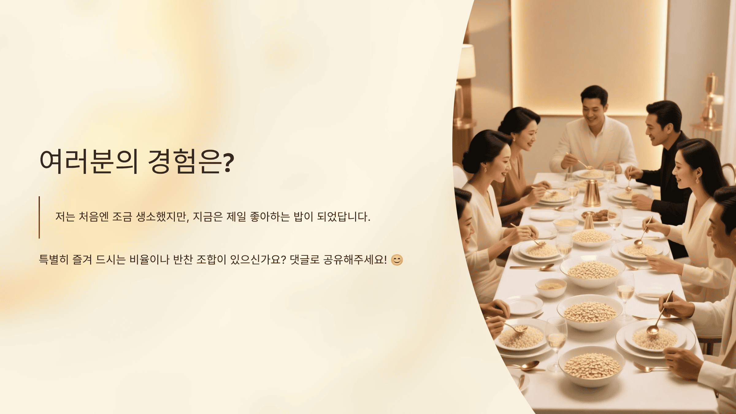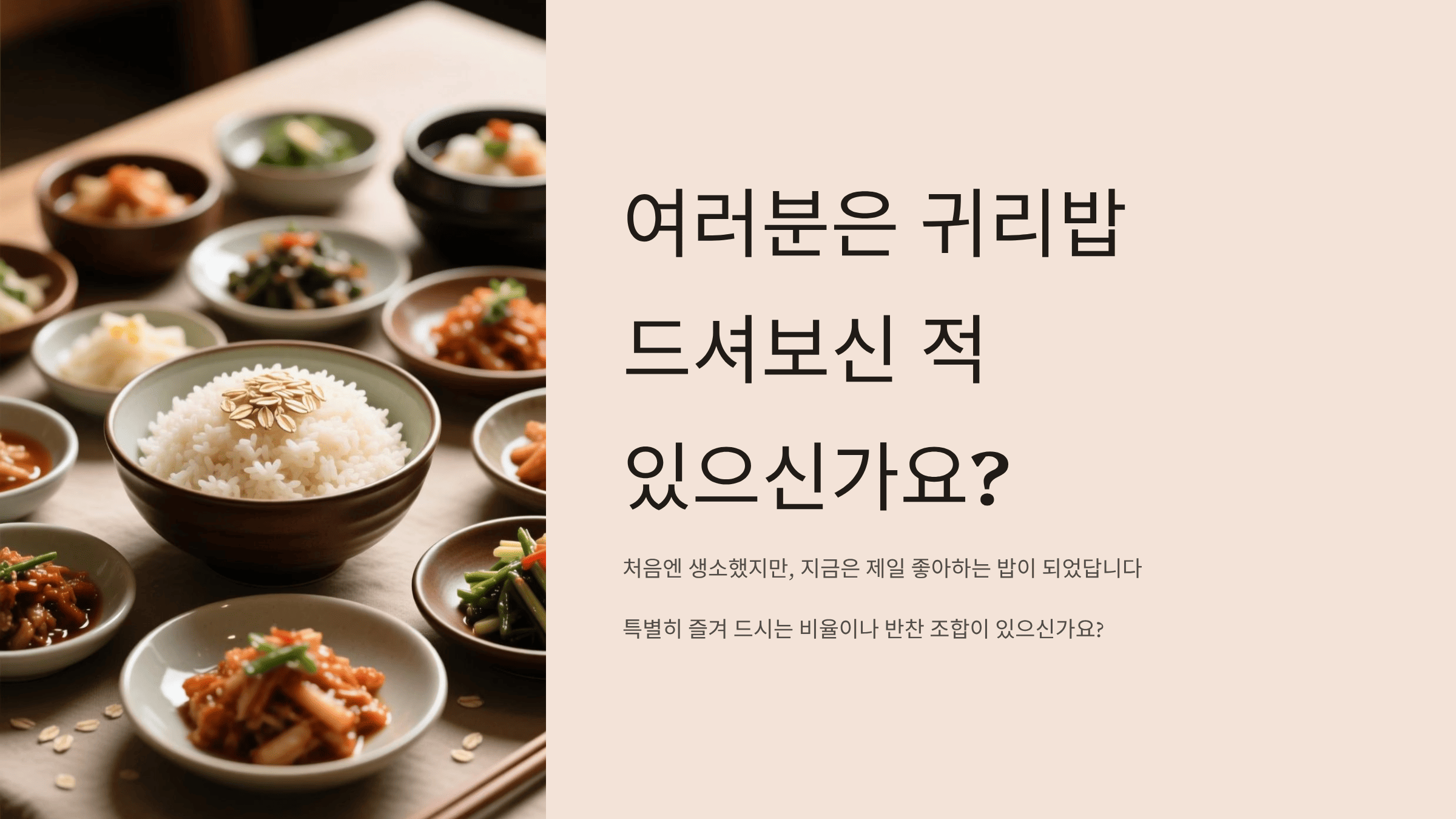 여러분은 귀리밥 드셔보신 적 있으신가요? 저는 처음엔 조금 생소했지만, 지금은 제일 좋아하는 밥이 되었답니다. 혹시 특별히 즐겨 드시는 비율이나 반찬 조합이 있으신가요? 댓글로 공유해주시면 서로 꿀팁을 나눌 수 있을 것 같아요!