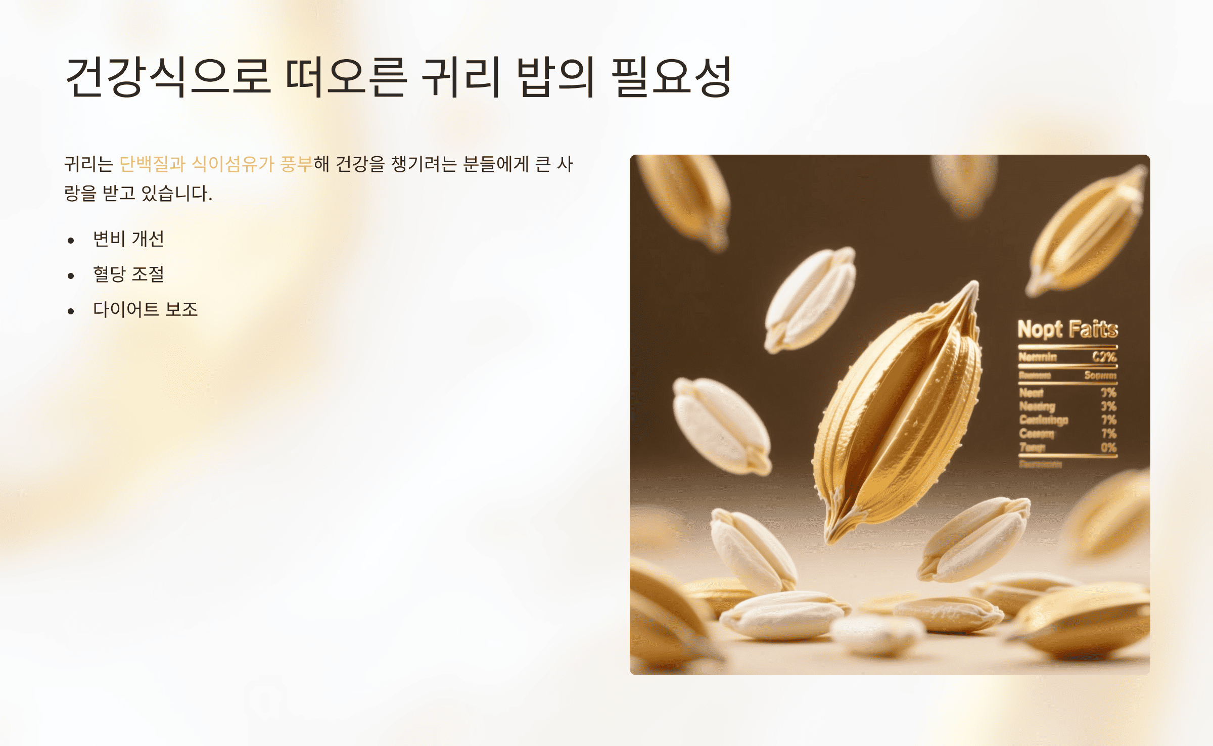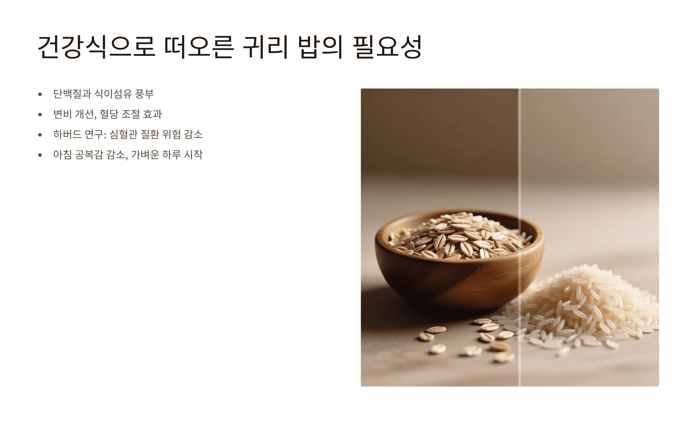 귀리는 단백질과 식이섬유가 풍부해 요즘 건강을 챙기려는 분들에게 큰 사랑을 받고 있습니다. 특히 변비 개선, 혈당 조절, 다이어트 보조 등에 효과적이라는 연구 결과가 많습니다. 예를 들어, 하버드 대학 연구에 따르면 통곡물 섭취가 심혈관 질환 위험을 낮춰준다고 밝혀졌어요. 저 역시 귀리를 꾸준히 먹으면서 아침 공복감이 덜하고 하루가 훨씬 가볍게 시작되더라고요. 이런 이유로 귀리 밥짓기를 생활 속 루틴으로 삼는 분들이 늘고 있습니다.