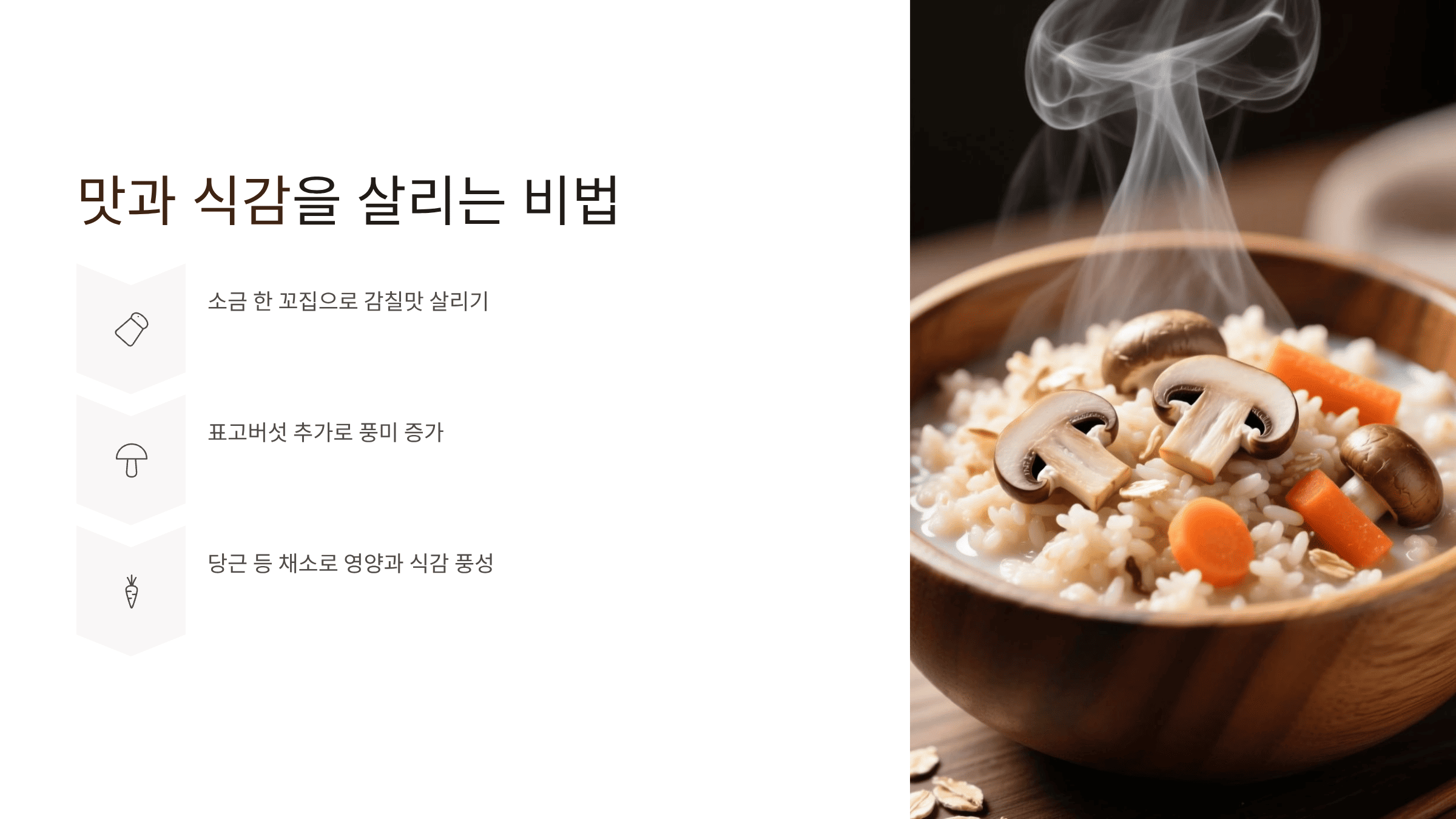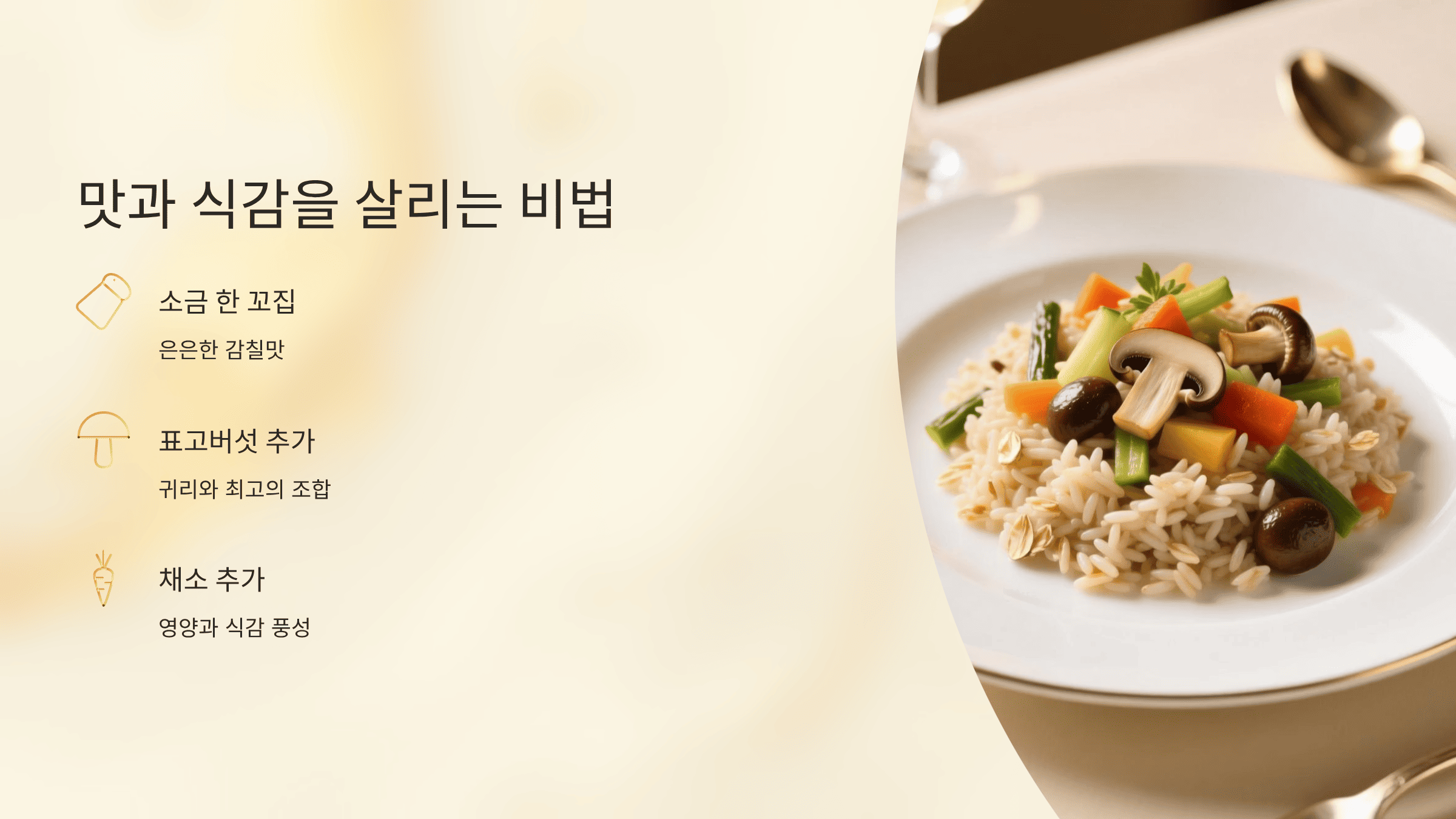 귀리밥을 맛있게 즐기려면 소금 한 꼬집을 넣어주면 은은하게 감칠맛이 살아납니다. 또 버섯이나 당근을 잘게 썰어 넣으면 영양은 물론 식감도 풍성해져요. 특히 표고버섯과 귀리 조합은 정말 별미라서, 저는 종종 채소와 함께 ‘귀리 영양밥’처럼 해 먹곤 합니다. 이렇게 조리하면 귀리 특유의 담백함이 더욱 부드럽게 다가와 누구나 쉽게 먹을 수 있습니다.