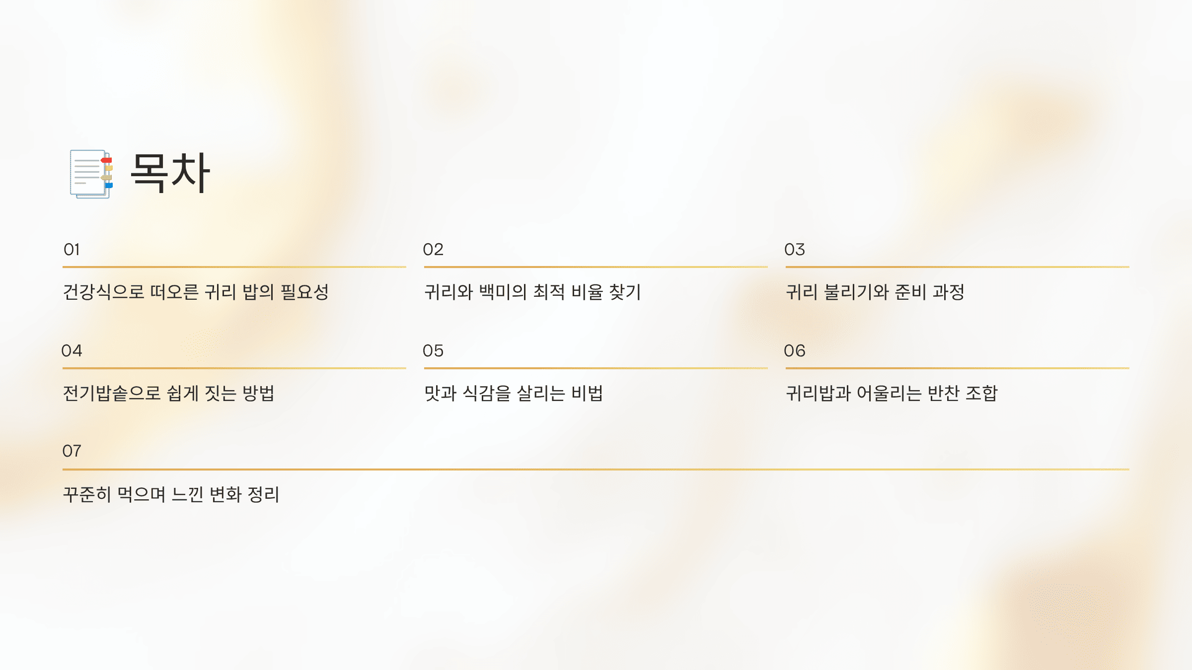 마지막으로 제 경험을 덧붙이자면, 귀리밥은 단순히 밥 한 끼 이상의 의미가 있는 것 같아요. 몸도 건강해지고, 식탁도 더 풍성해지는 느낌을 주니까요. 다음 글에서는 귀리를 활용한 다양한 레시피를 소개해 드릴게요. 기대해 주세요!
