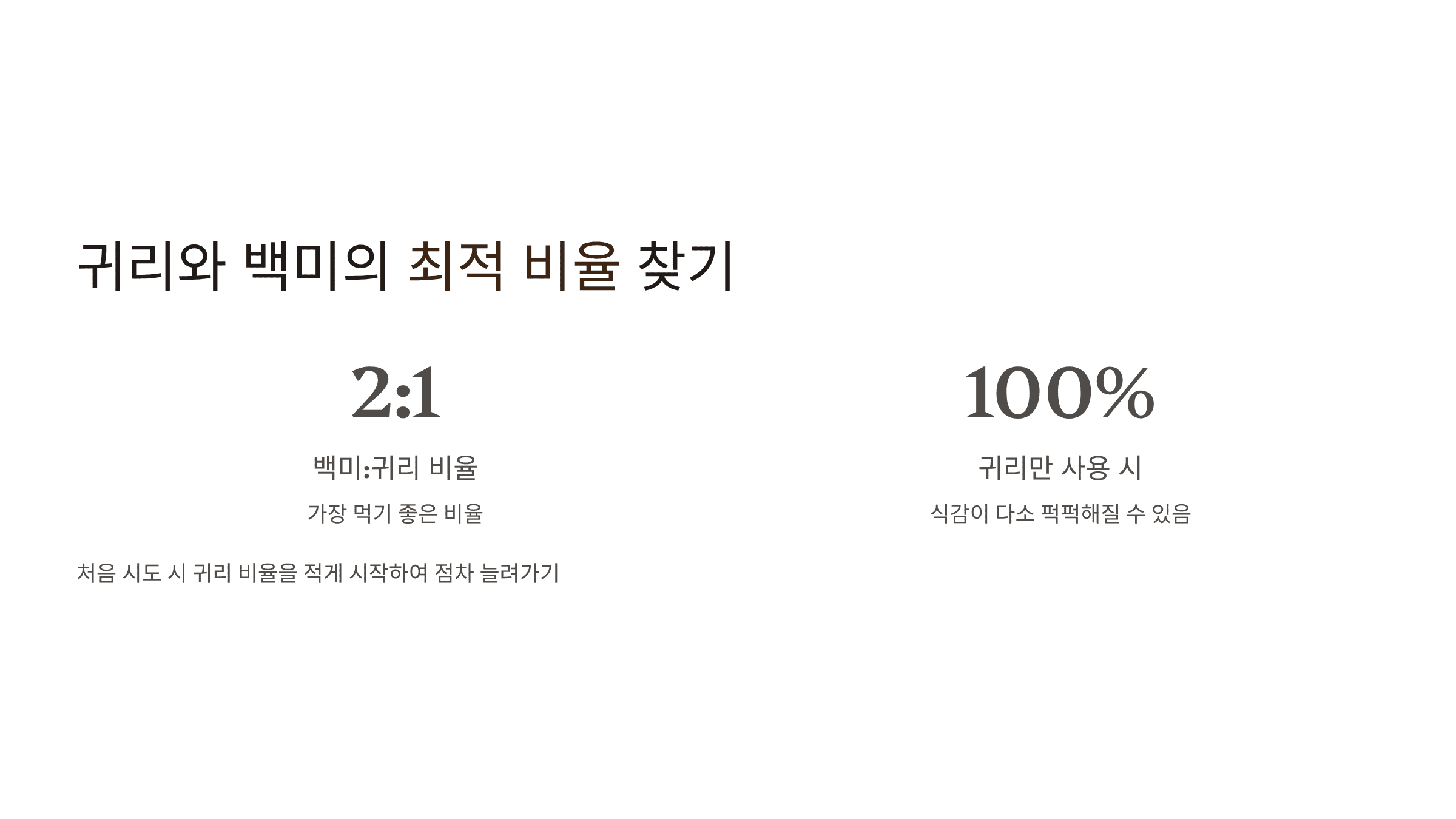 귀리는 단단한 곡물이라 백미와 섞어야 맛과 식감이 균형을 이룹니다. 제가 여러 번 시도해본 결과 백미 2컵에 귀리 1컵 비율이 가장 먹기 좋았습니다. 처음 시도하신다면 귀리를 조금 적게 넣고, 점차 늘려가면서 입맛에 맞는 비율을 찾으시면 좋아요. 100% 귀리밥도 가능하지만 식감이 다소 퍽퍽해질 수 있으니 참고하세요.
