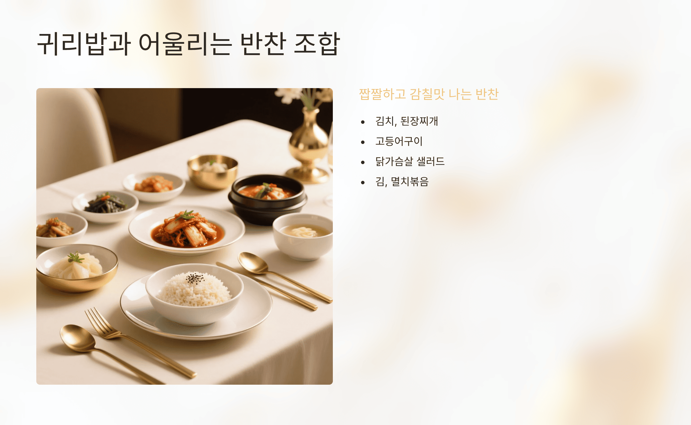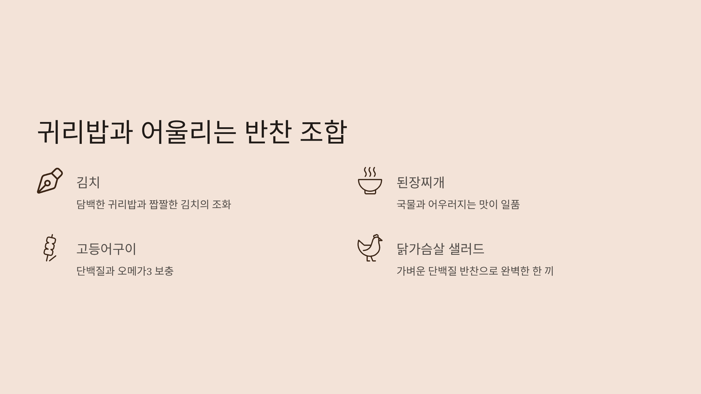 귀리밥은 담백한 맛이 강하기 때문에, 반찬은 짭짤하거나 감칠맛이 있는 게 잘 어울립니다. 김치, 된장찌개, 고등어구이 같은 한국적인 반찬은 물론이고, 닭가슴살 샐러드처럼 가벼운 단백질 반찬과도 잘 맞습니다. 저는 주로 김치찌개에 귀리밥을 곁들이는데, 국물과 밥이 어우러지는 맛이 정말 좋습니다. 요즘은 간단하게 김이나 멸치볶음만 있어도 충분히 만족스럽더라고요.