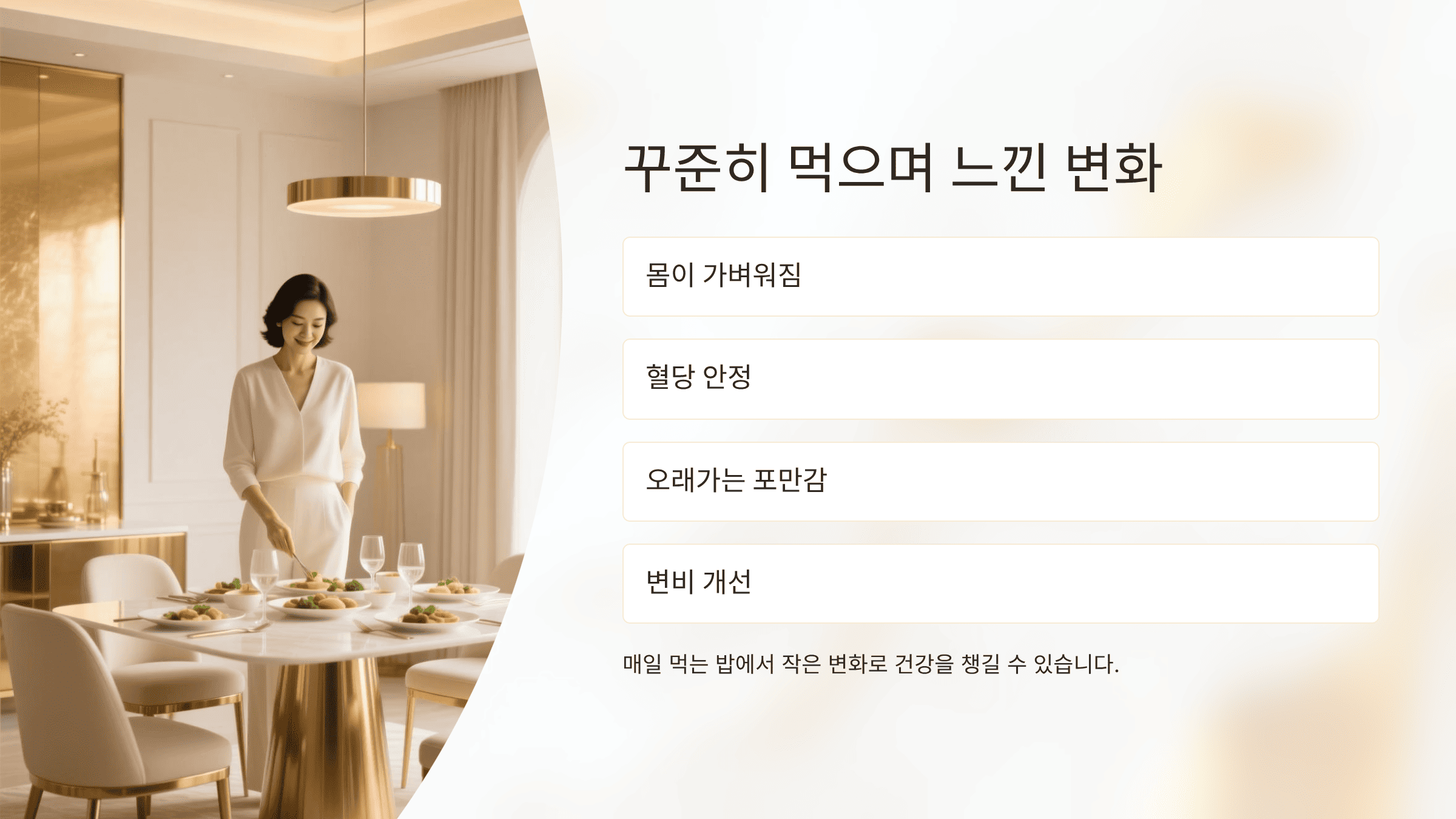 귀리밥을 꾸준히 먹으니 확실히 몸이 가벼워지고, 아침 공복 혈당이 조금 안정되는 느낌이 있었습니다. 또 포만감이 오래 가서 군것질을 줄이게 되더라고요. 변비가 있는 분들에게도 도움이 많이 될 거예요. 무엇보다도, 매일 먹는 밥에서 작은 변화를 주는 것만으로도 건강을 챙길 수 있다는 점이 큰 장점입니다. 저는 이제 귀리밥이 없으면 밥상이 허전할 정도랍니다.