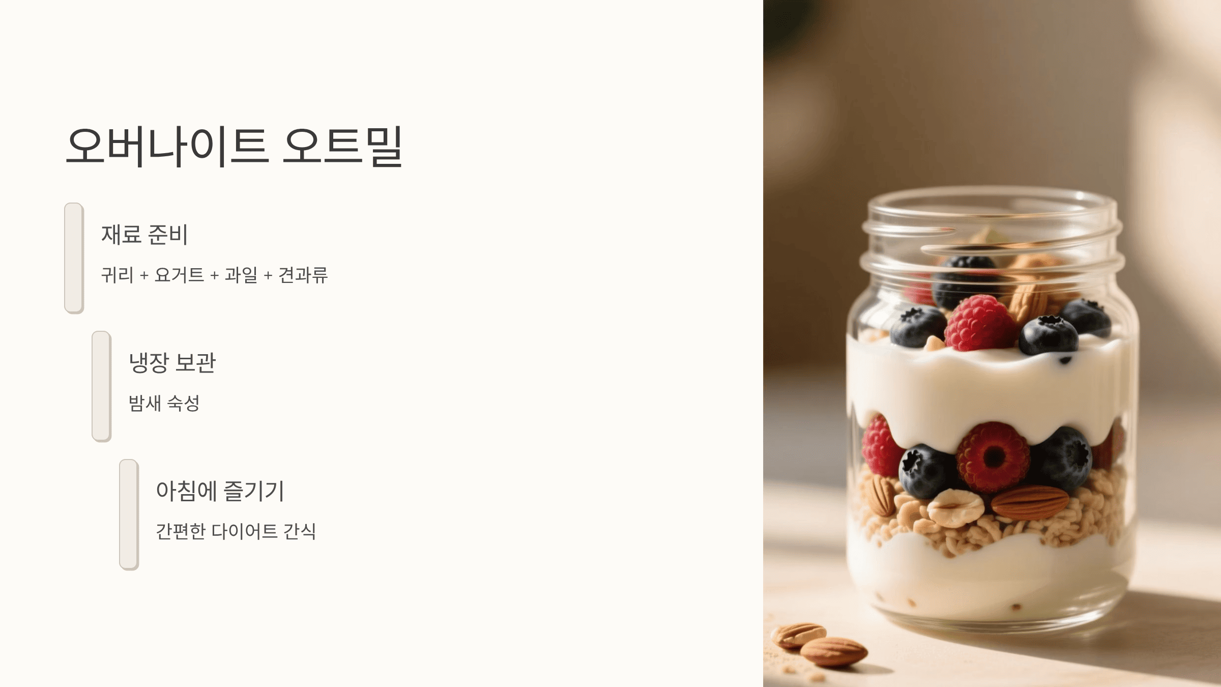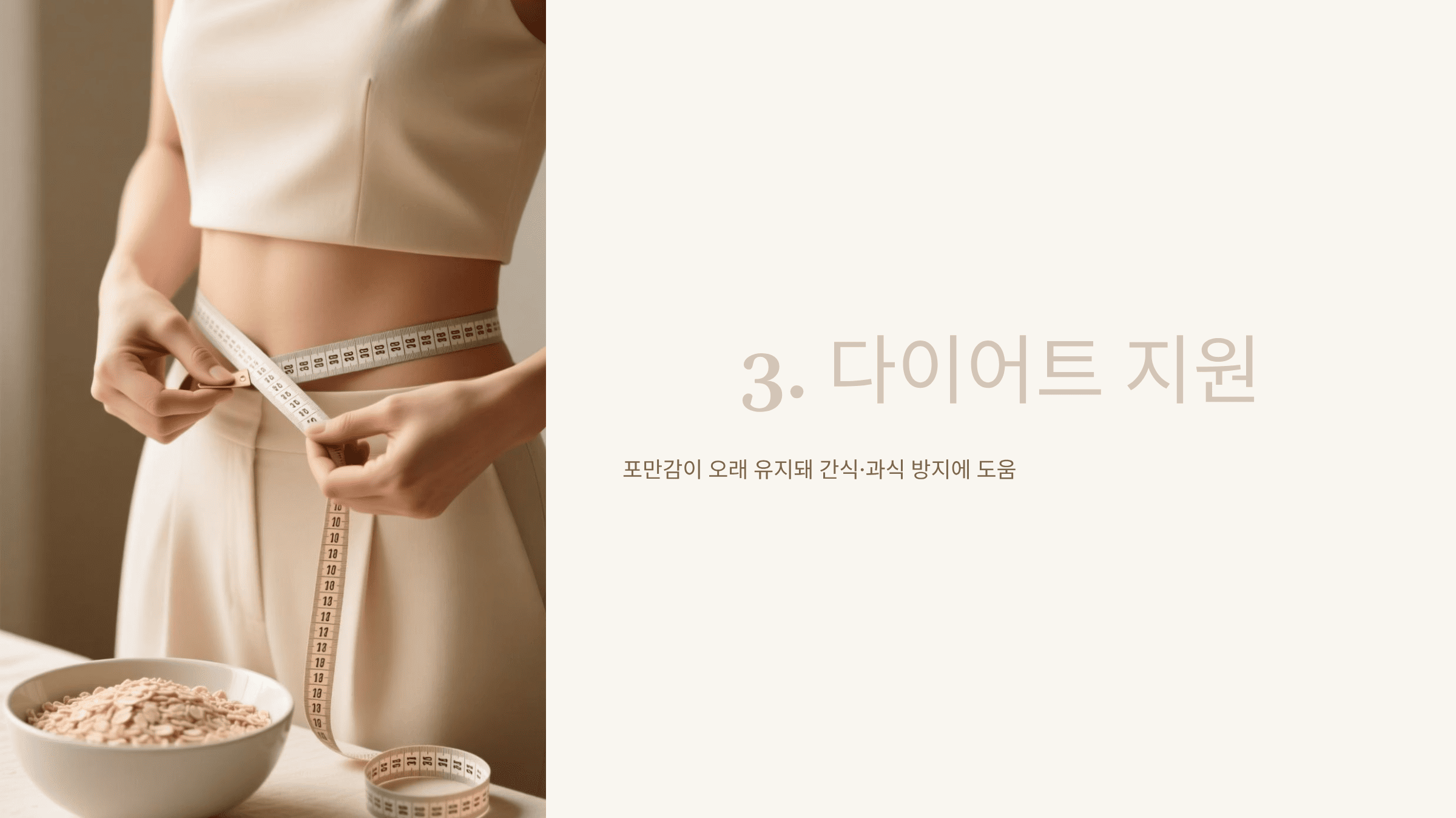 → 압착귀리는 불릴 필요 없고, 통귀리는 6–8시간 불리면 좋아요. - 귀리로 다이어트 가능할까요?