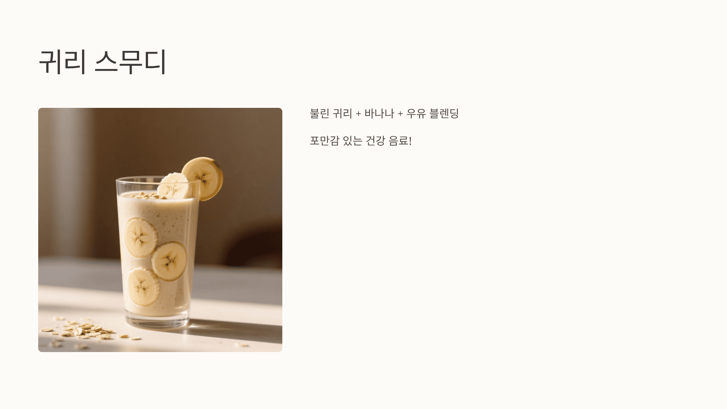 → 귀리죽은 곡물 죽 형태, 오트밀은 압착귀리를 활용한 식사 형태입니다. - 귀리 스무디 맛있게 먹는 방법은?
