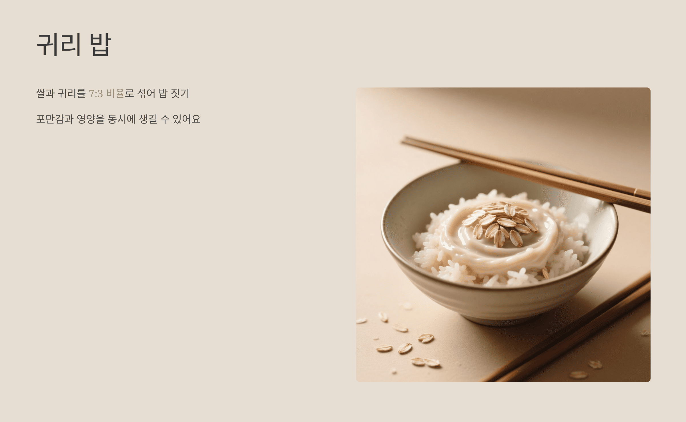 → 하루 40~50g 정도가 적당합니다. - 귀리밥 비율은 어떻게 하나요?