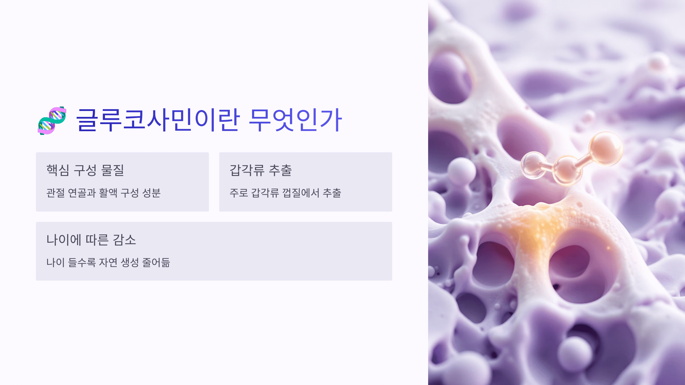 주로 갑각류 껍질에서 추출되며, 체내에서 연골을 유지하고 관절 마모를 방지하는 역할을 하죠.