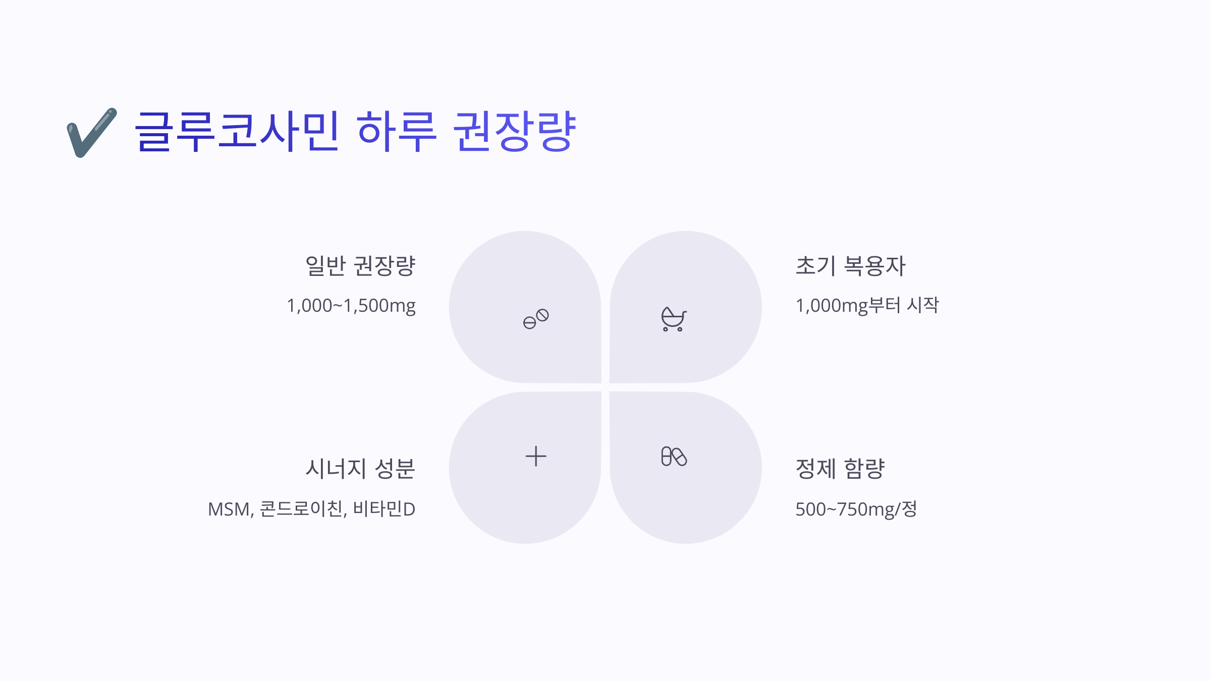 💡 MSM, 콘드로이친, 비타민D와 함께 복용하면 시너지 효과를 낼 수 있어요.