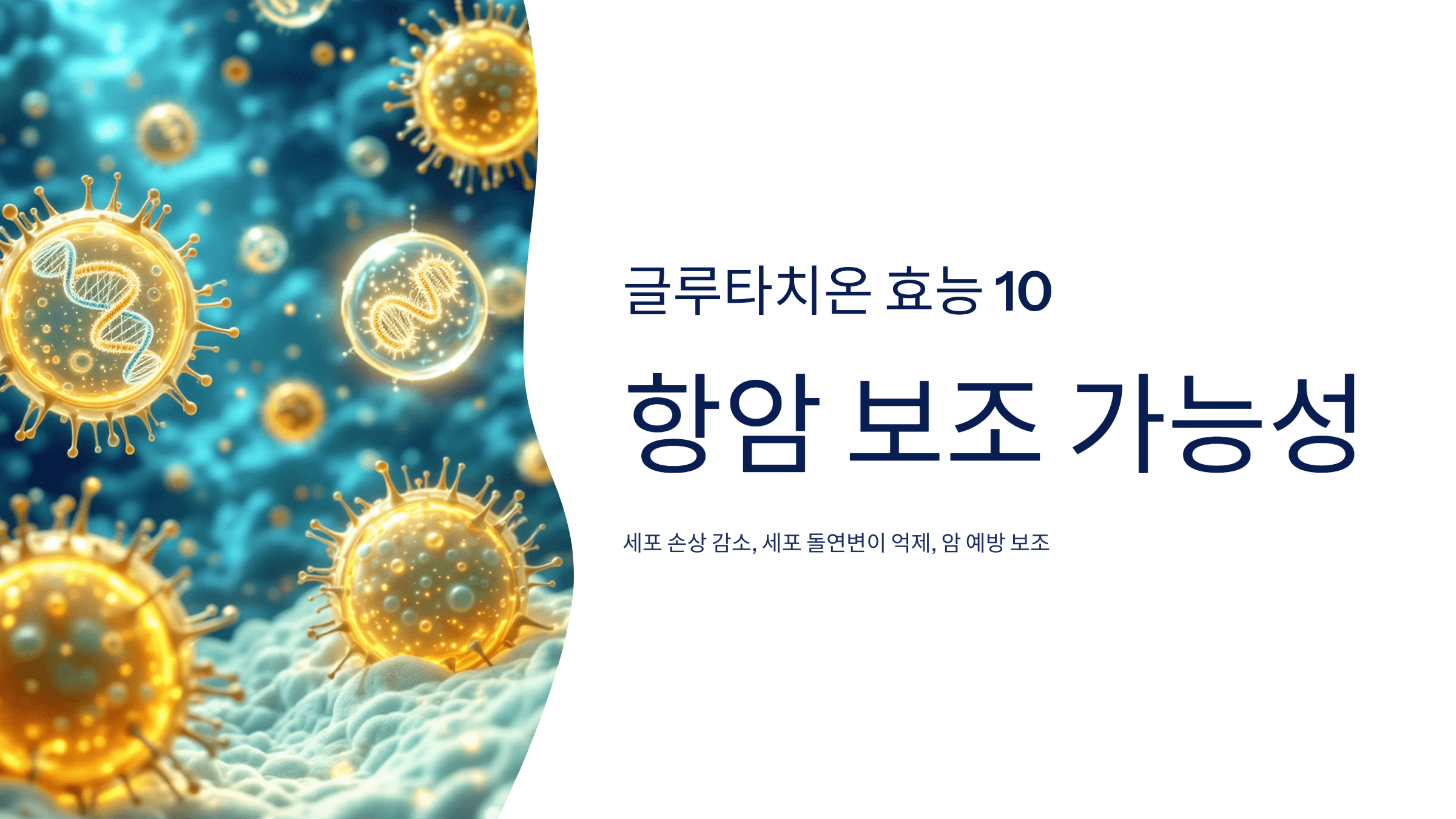 글루타치온은 세포의 DNA 손상을 줄이고, 세포 돌연변이 억제에 도움을 줍니다.