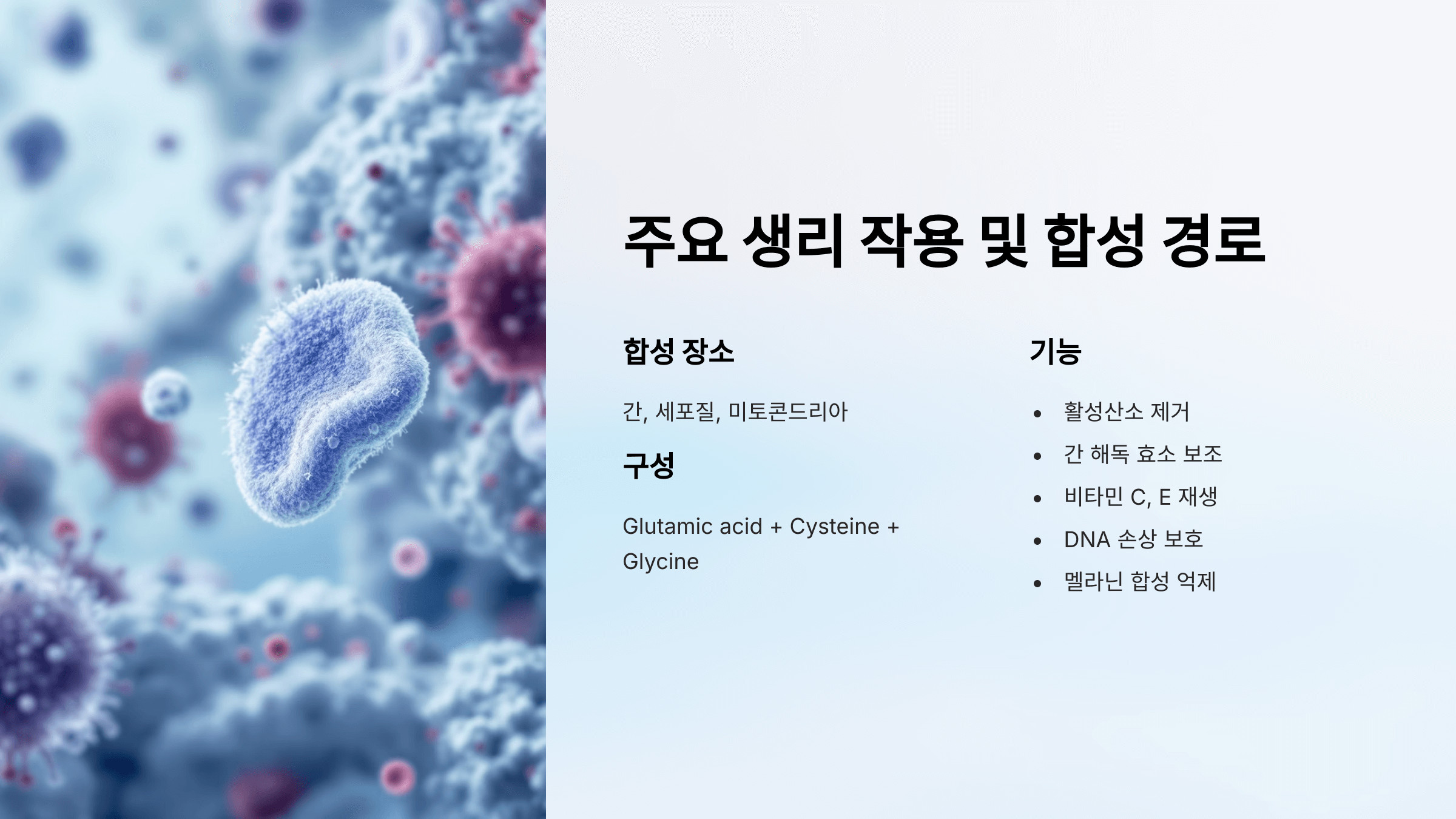 간과 세포 내에서 강력한 항산화 작용을 하며, 해독, 미백, 노화 예방, 면역 기능 향상 등 광범위한 건강 작용으로 주목받고 있어요.