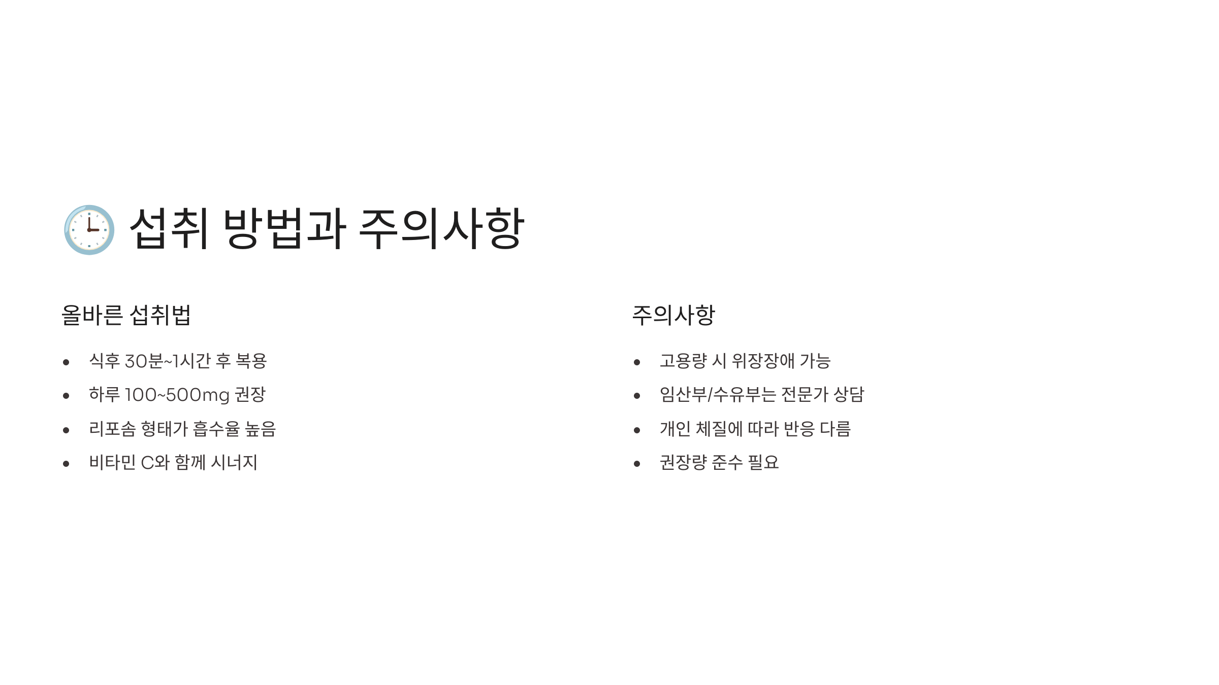 - 복용 시기: 공복보단 식후 30분~1시간 후 섭취가 흡수에 유리해요.