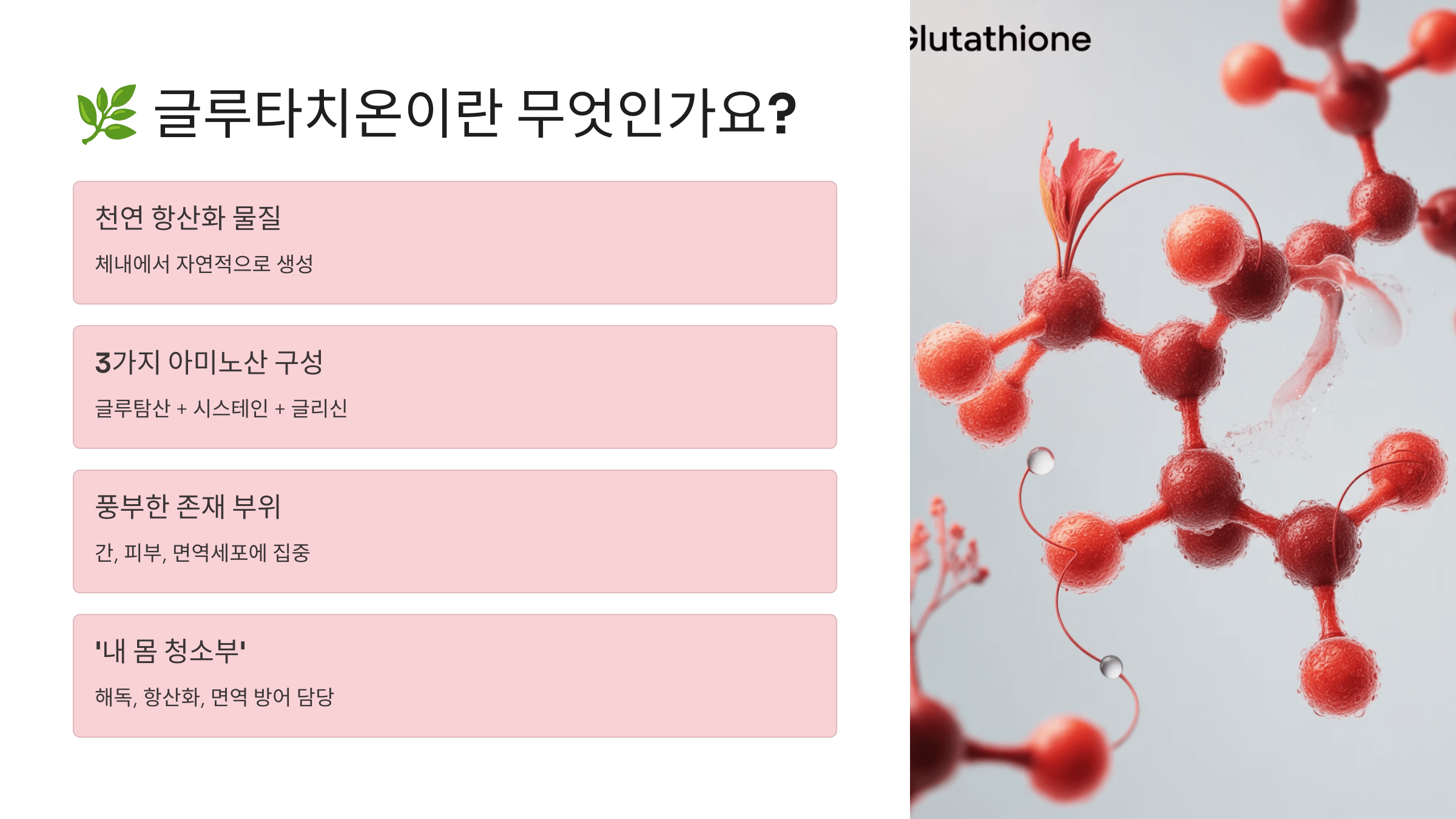 글루타치온(Glutathione)은 체내에서 만들어지는 천연 항산화 물질이에요.