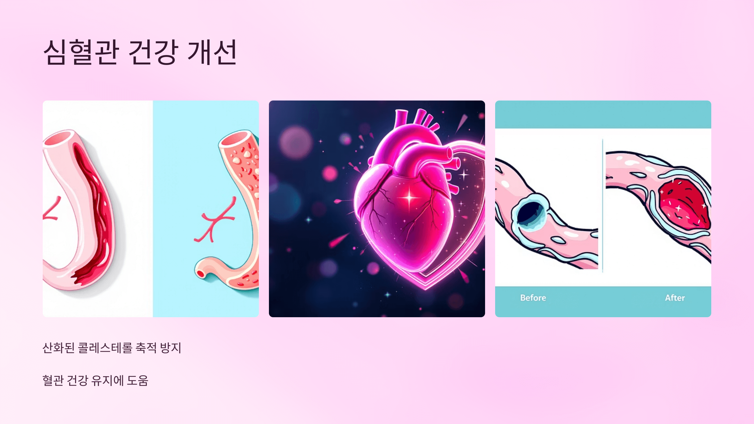 산화된 콜레스테롤 축적을 막고, 혈관 건강 유지에 도움을 줍니다.