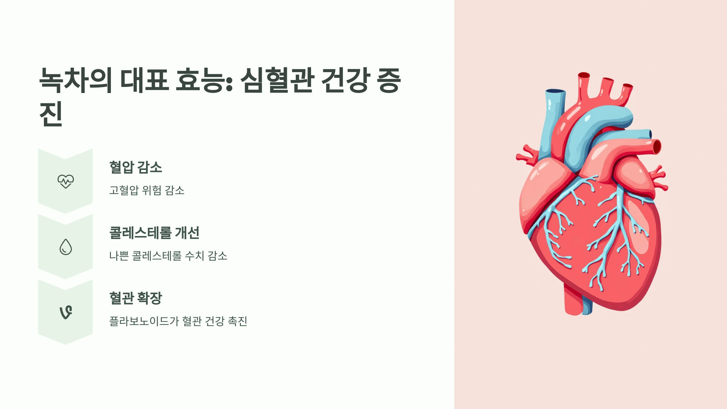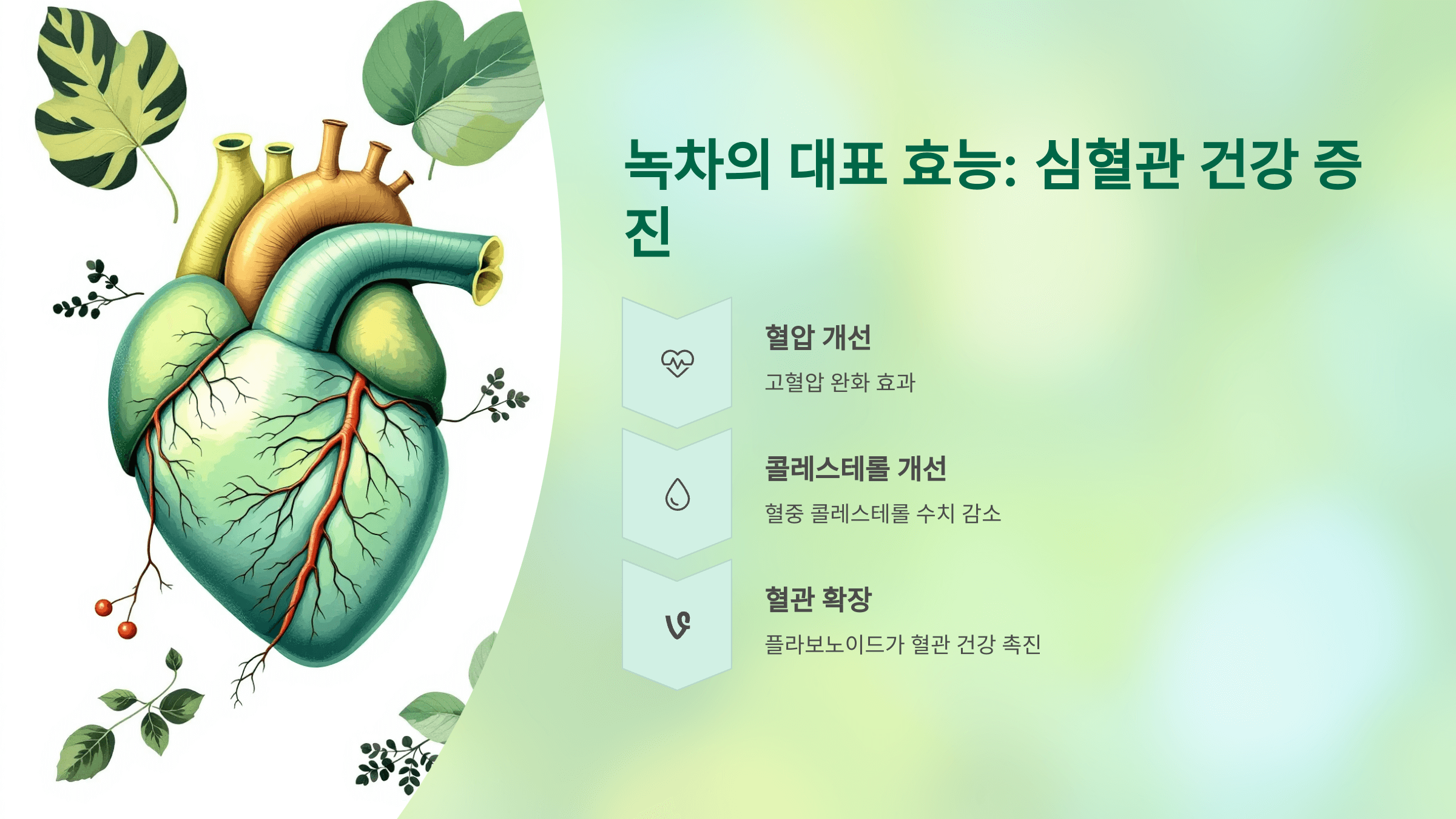 녹차는 혈압을 낮추고, 혈중 콜레스테롤 수치를 개선하여 심혈관 질환 예방에 기여합니다.