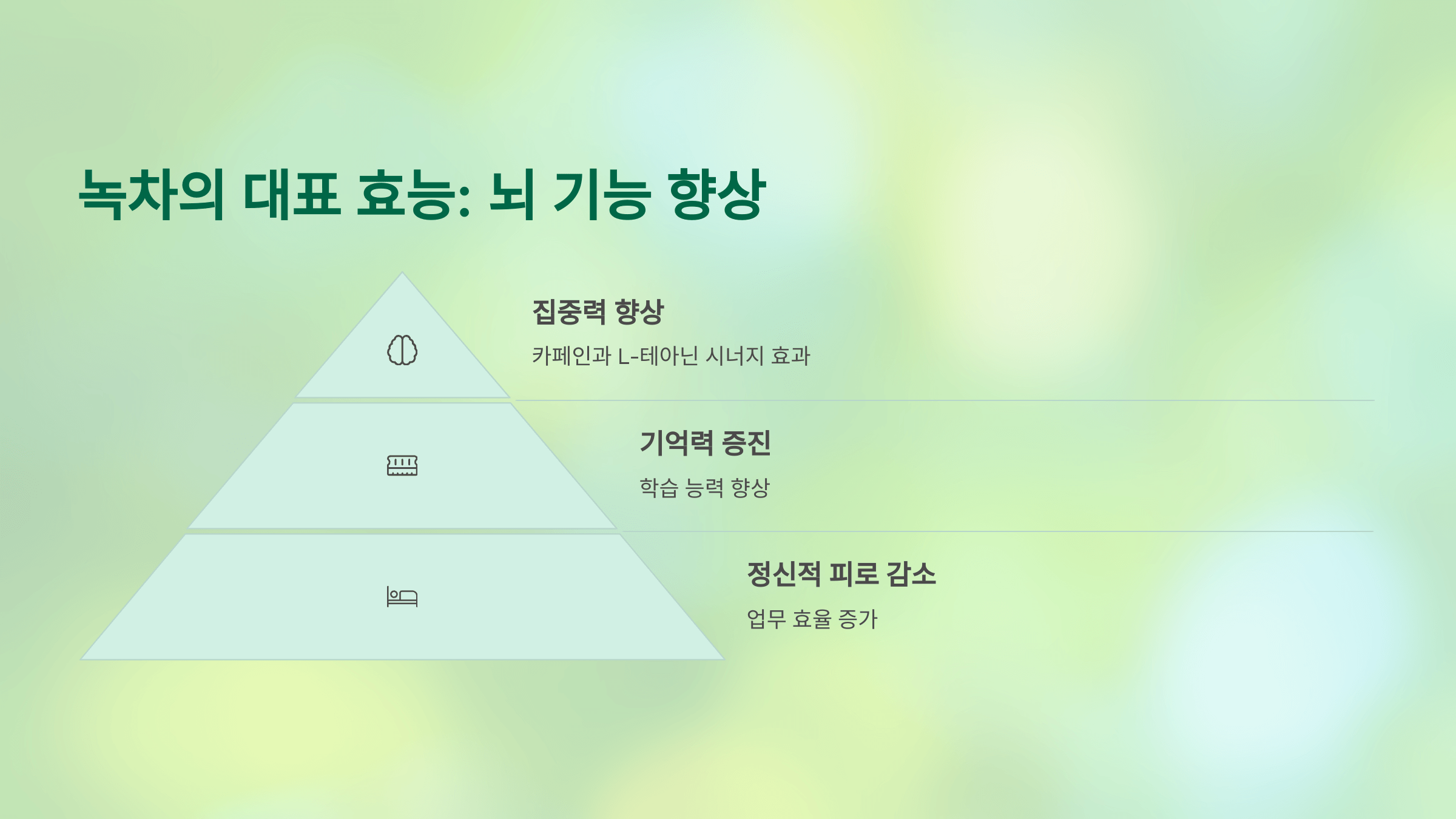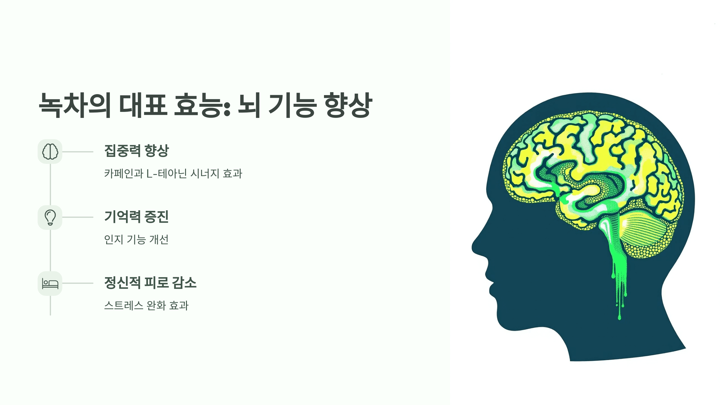 녹차에 포함된 카페인과 L-테아닌은 집중력과 기억력을 향상시키고, 정신적 피로를 줄여줍니다.