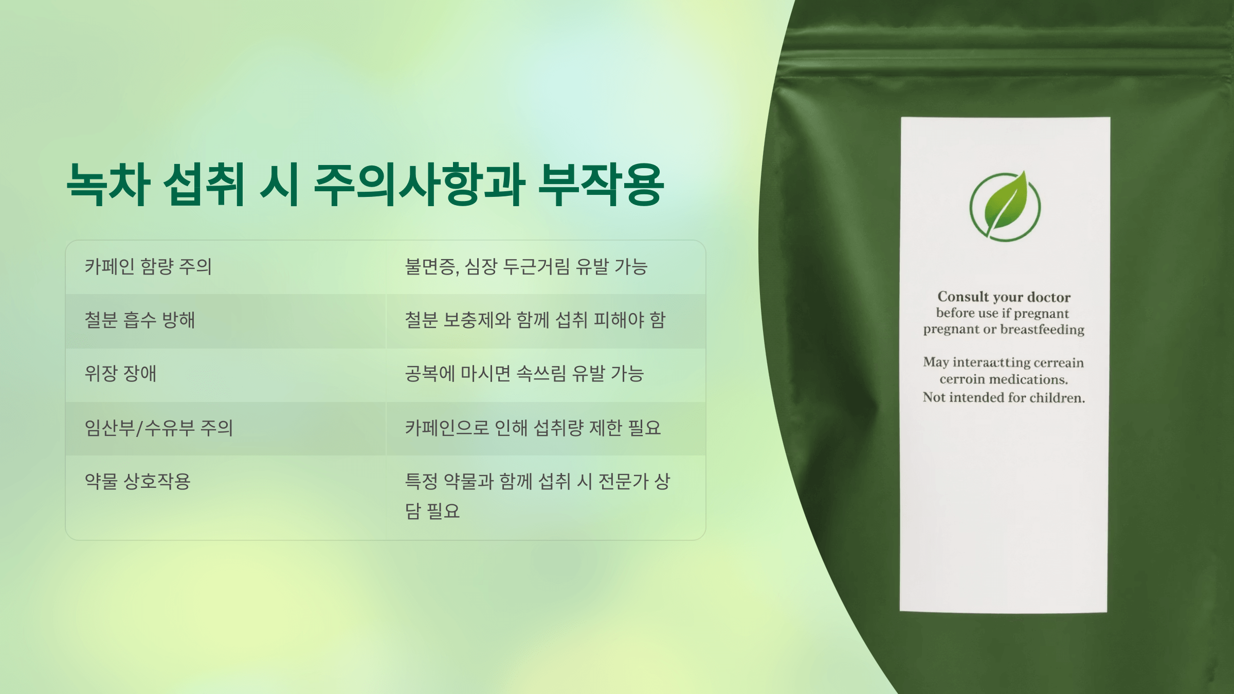 녹차에는 카페인이 포함되어 있어 과도한 섭취 시 불면증이나 심장 두근거림을 유발할 수 있어요. - 철분 흡수 방해