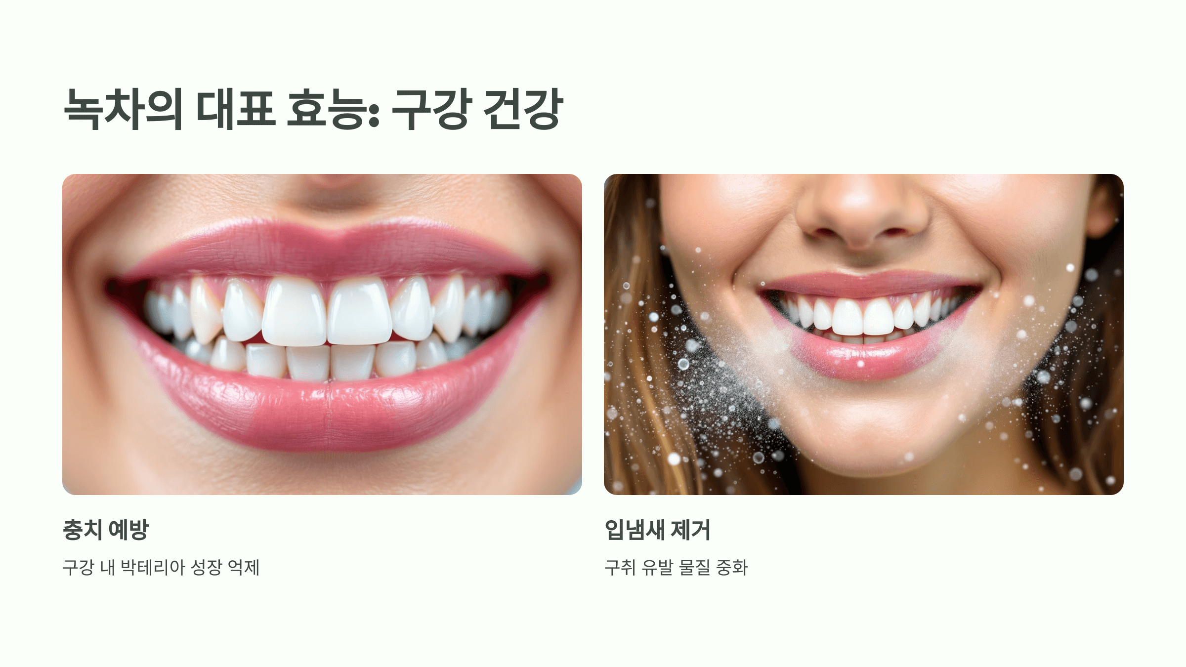 녹차는 구강 내 박테리아 성장을 억제하여 충치와 잇몸 질환 예방에 도움을 줍니다.