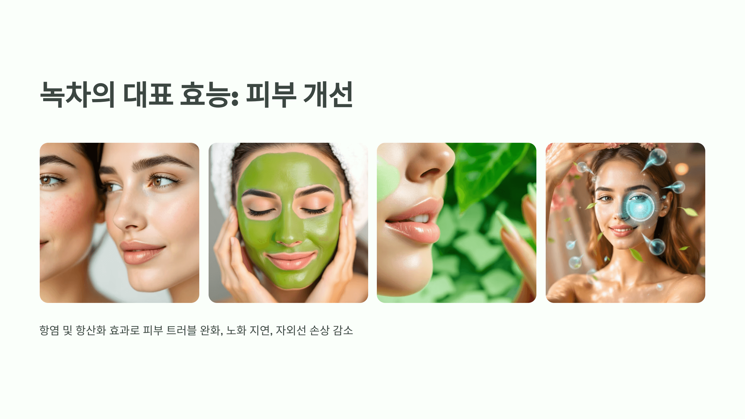 녹차의 항염 및 항산화 효과는 피부 트러블을 완화하고, 피부 노화를 늦추는 데 도움을 줍니다.