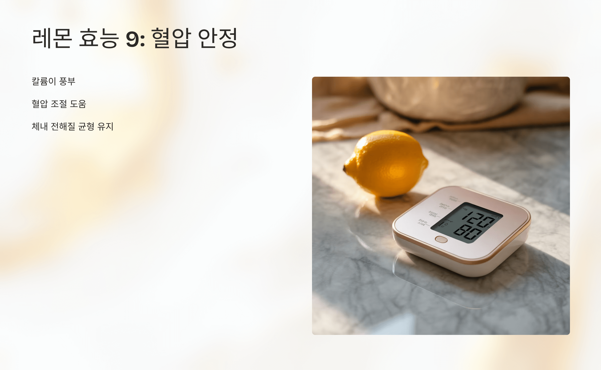 레몬에 포함된 플라보노이드는 혈관 건강과 혈압 조절에 긍정적입니다.