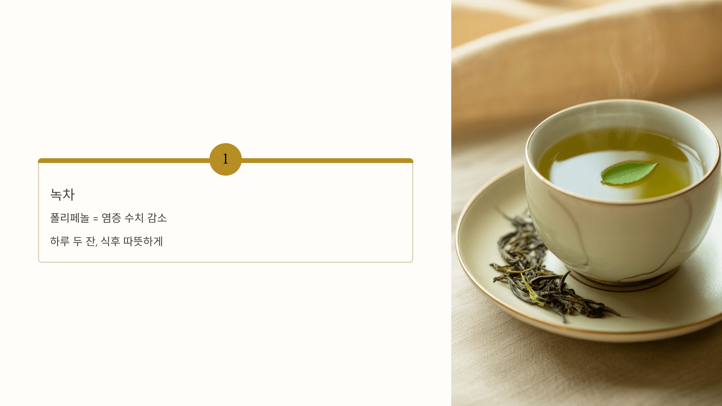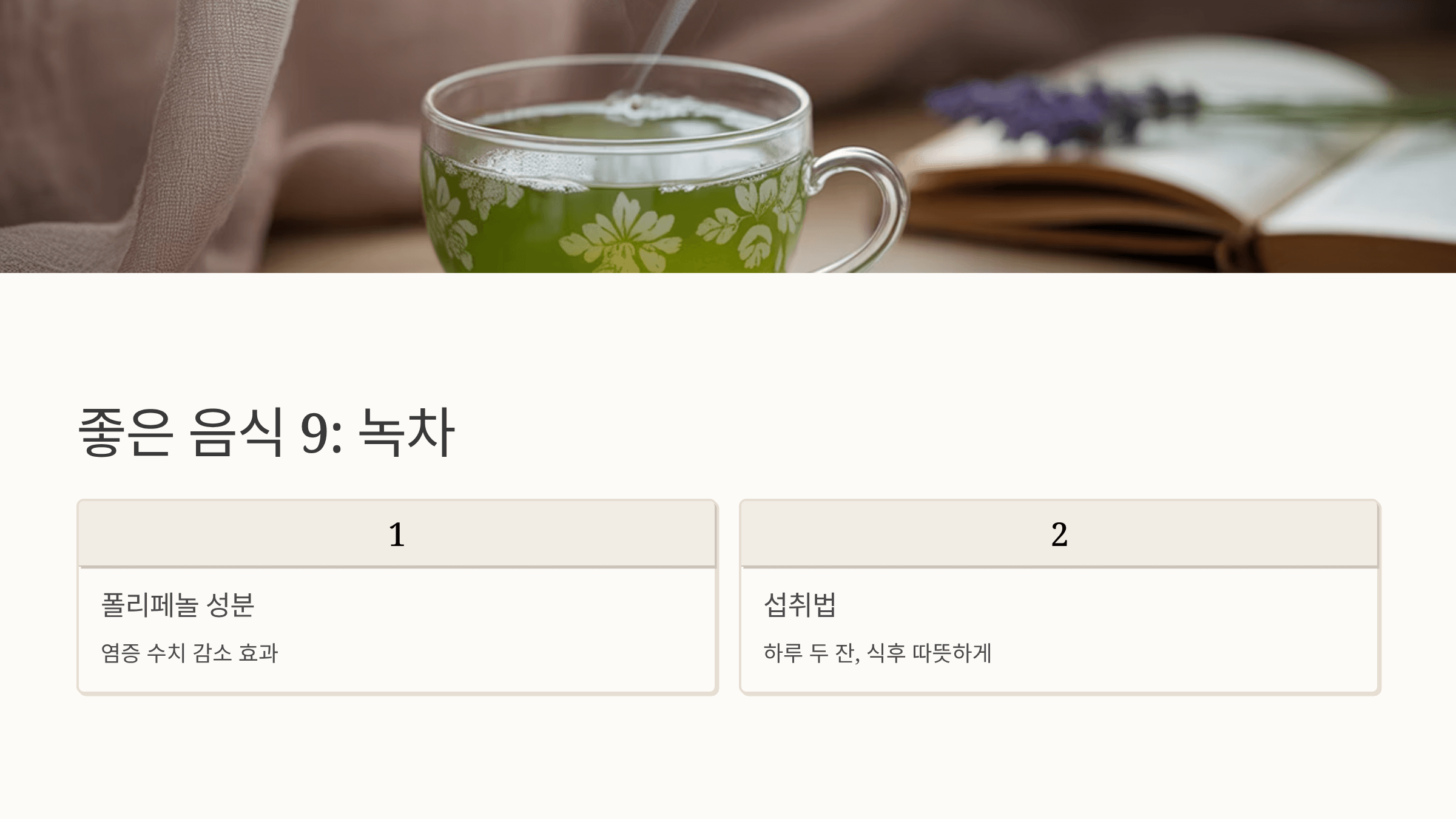폴리페놀 성분이 염증 수치를 낮춰줘요. 하루 두 잔 정도, 식후에 따뜻하게 마셔보세요.