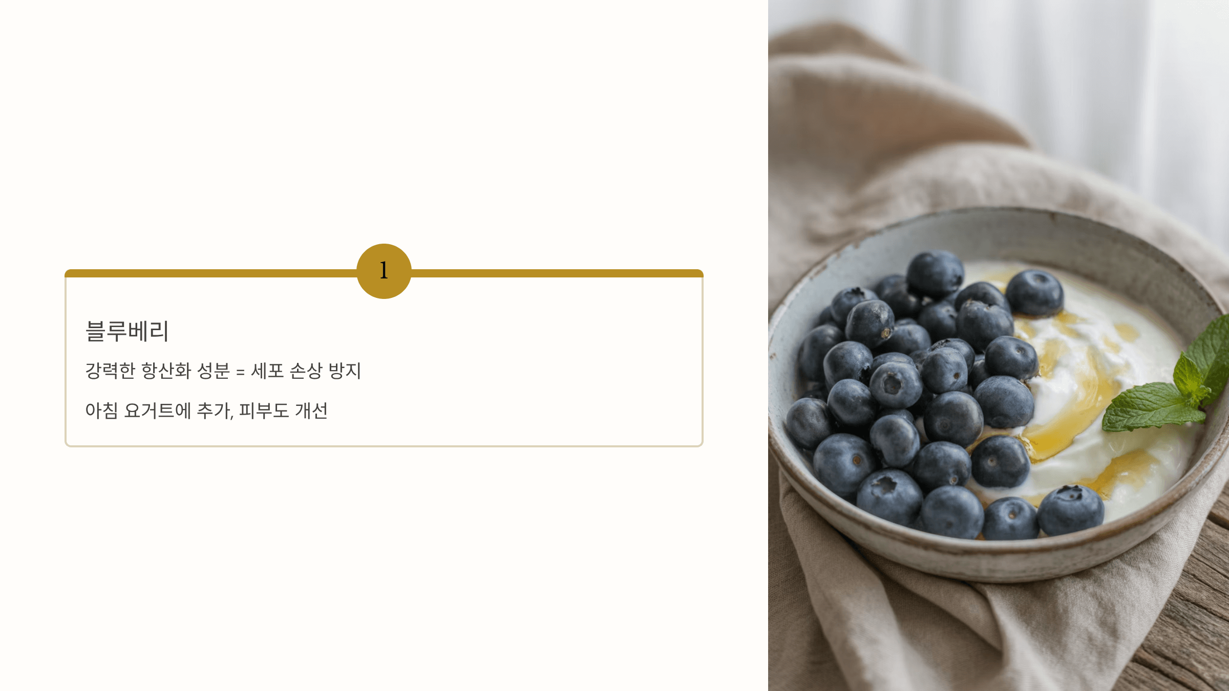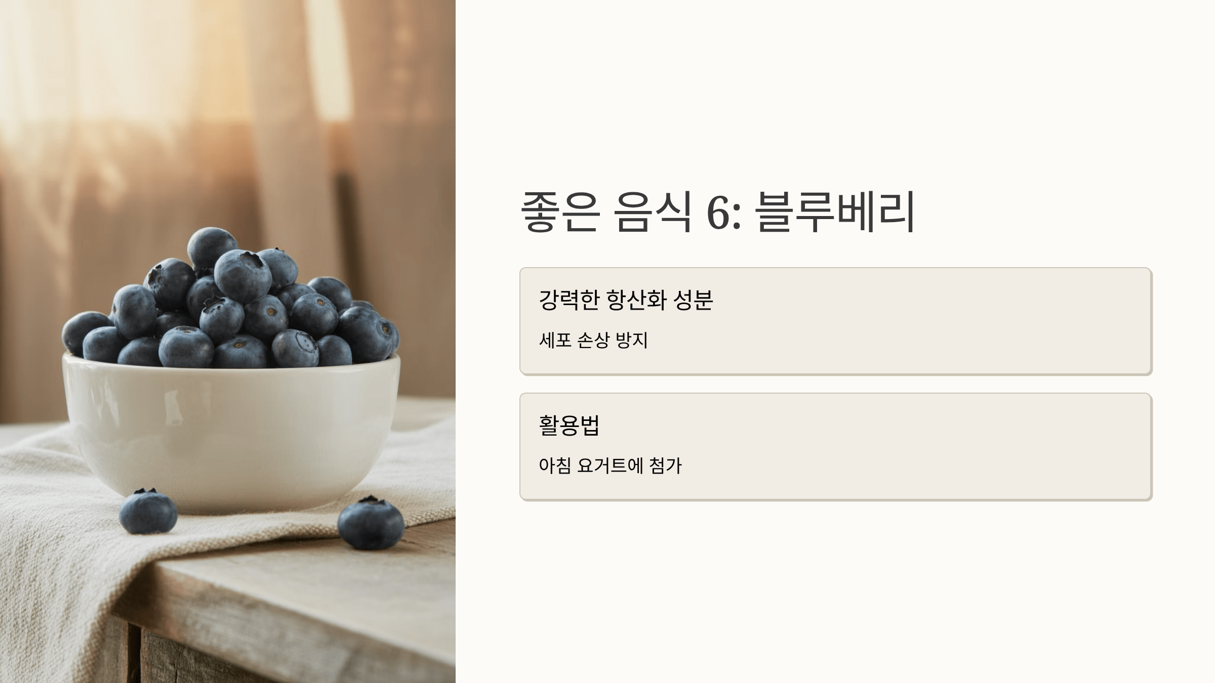 강력한 항산화 성분이 세포 손상을 막아줘요. 아침마다 요거트에 블루베리를 넣어 먹는 습관으로 피부도 맑아졌어요 🫐