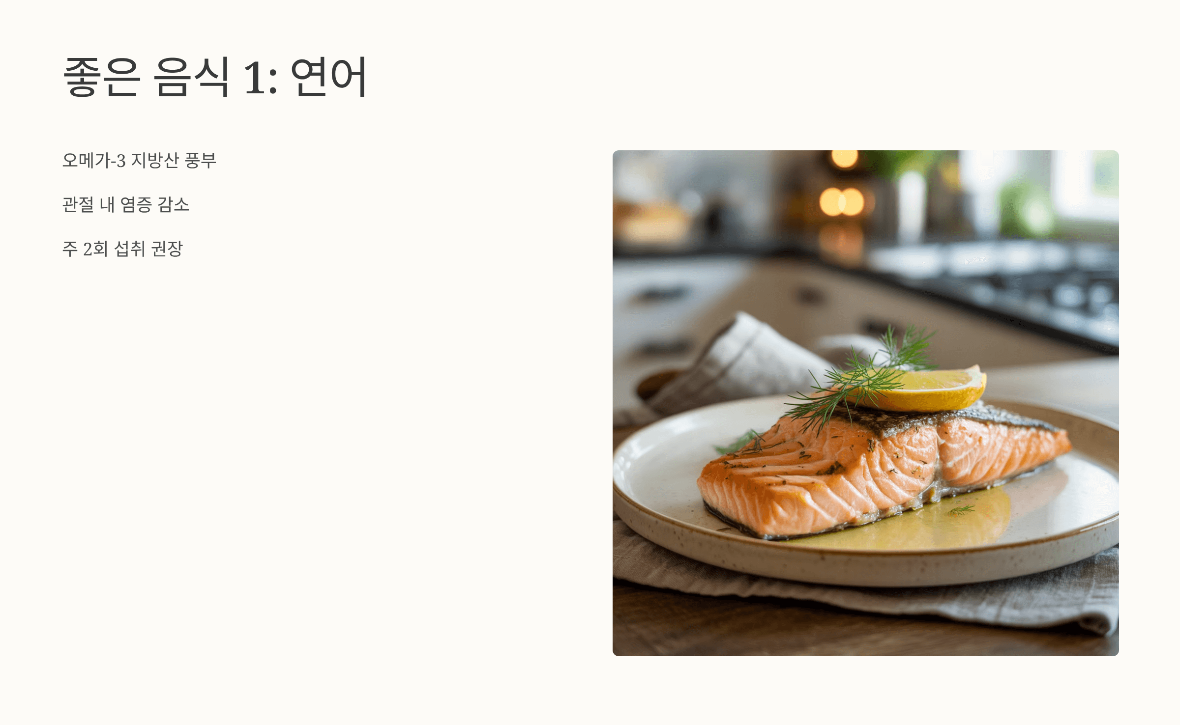 오메가-3 지방산이 풍부해 관절 내 염증을 줄여줍니다. 저는 주 2회 연어를 구워 먹는데, 손목 통증이 덜한 날이 확실히 많아졌어요.