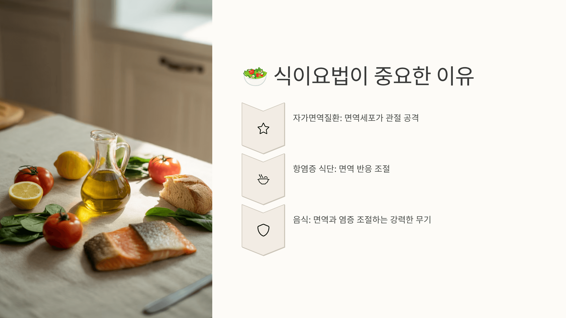 류마티스 관절염은 자가면역질환이에요. 면역세포가 관절을 공격하면서 염증이 생기고, 이것이 통증과 부종으로 이어지죠. 항염증 식단은 이 면역 반응을 조절하고 염증 수치를 낮추는 데 큰 역할을 해요.