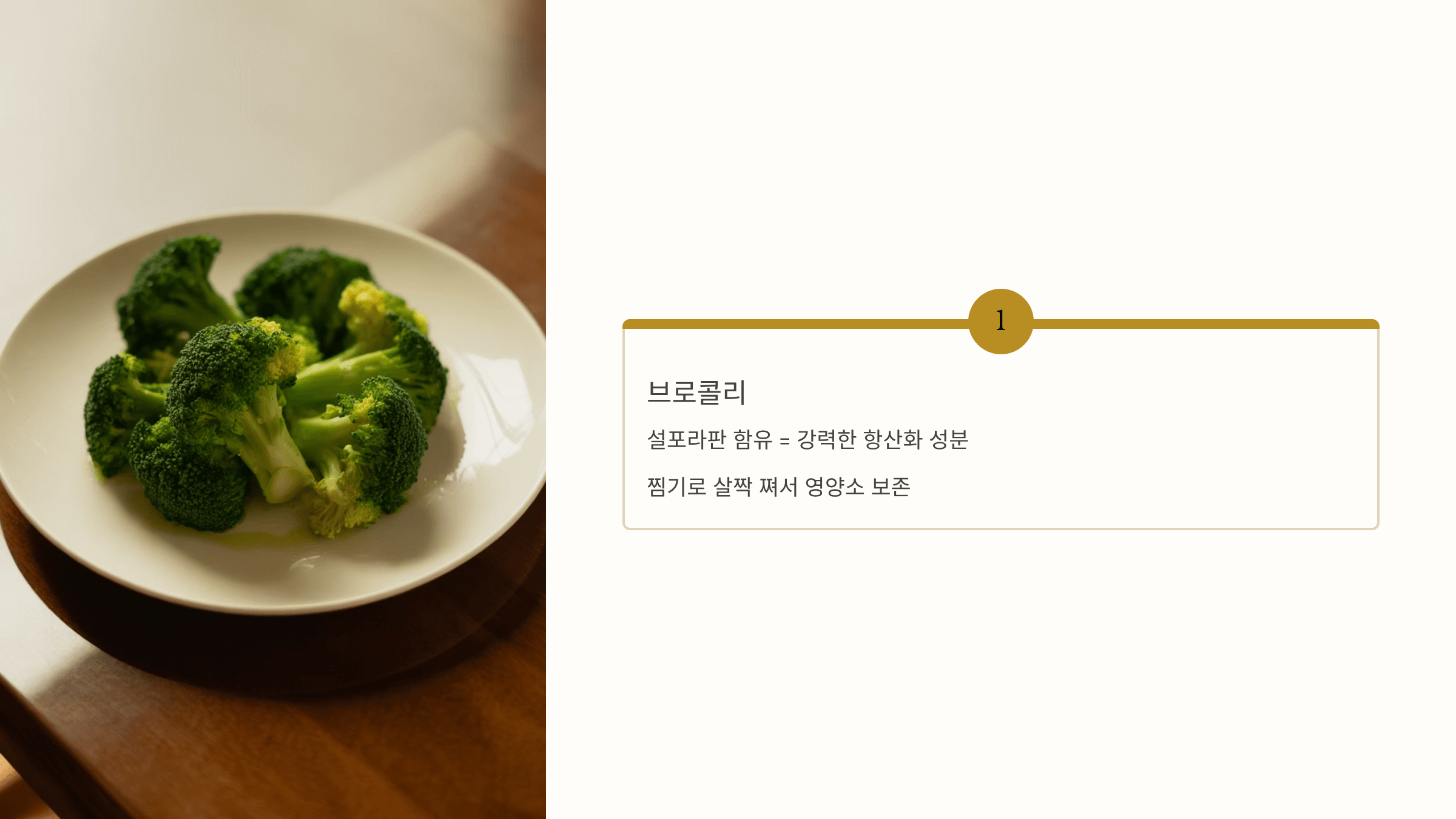 설포라판이라는 강력한 항산화 성분이 들어있어 염증 완화에 도움을 줍니다. 찜기로 살짝 쪄서 먹으면 영양소 파괴도 줄일 수 있어요.