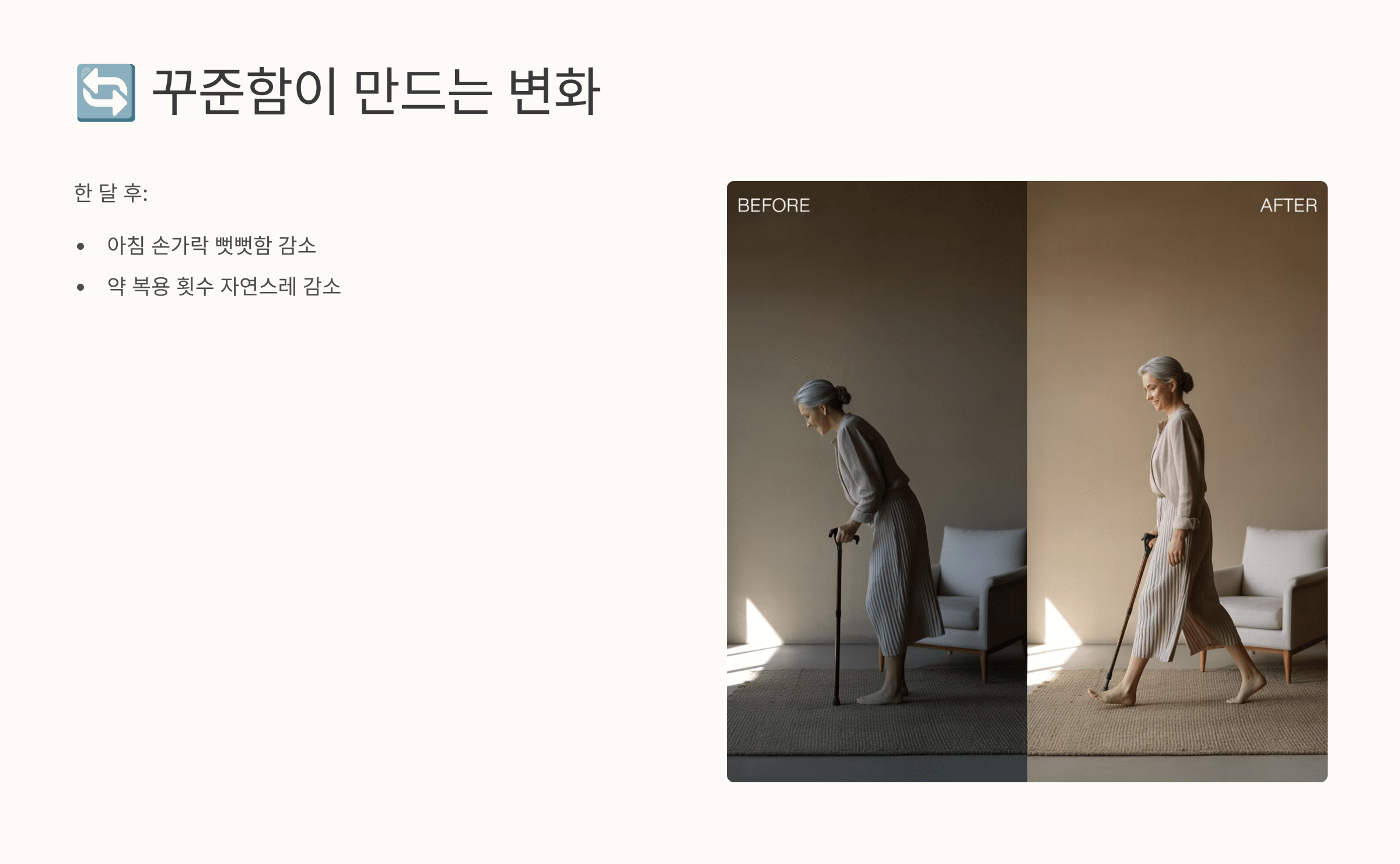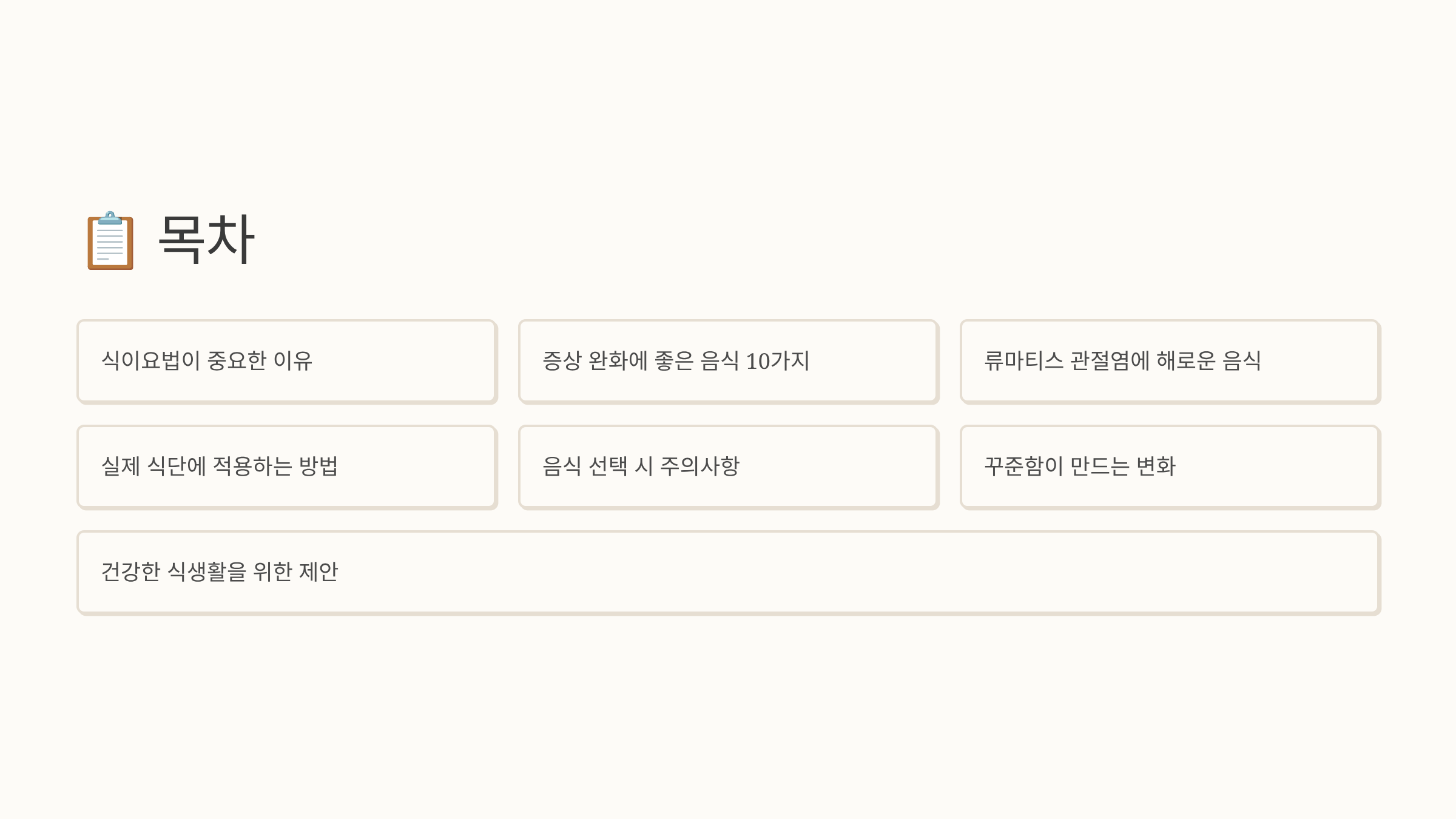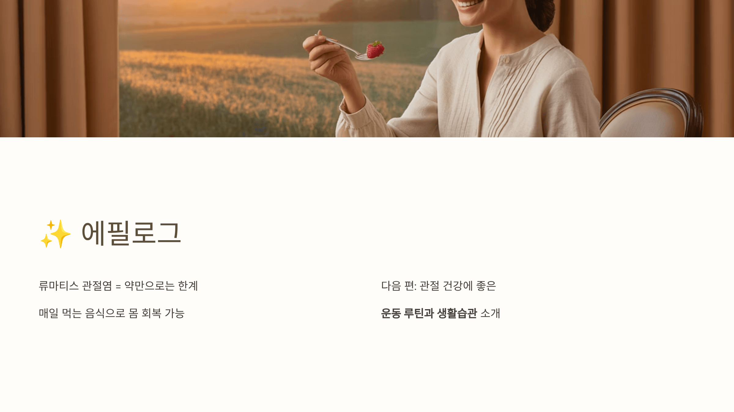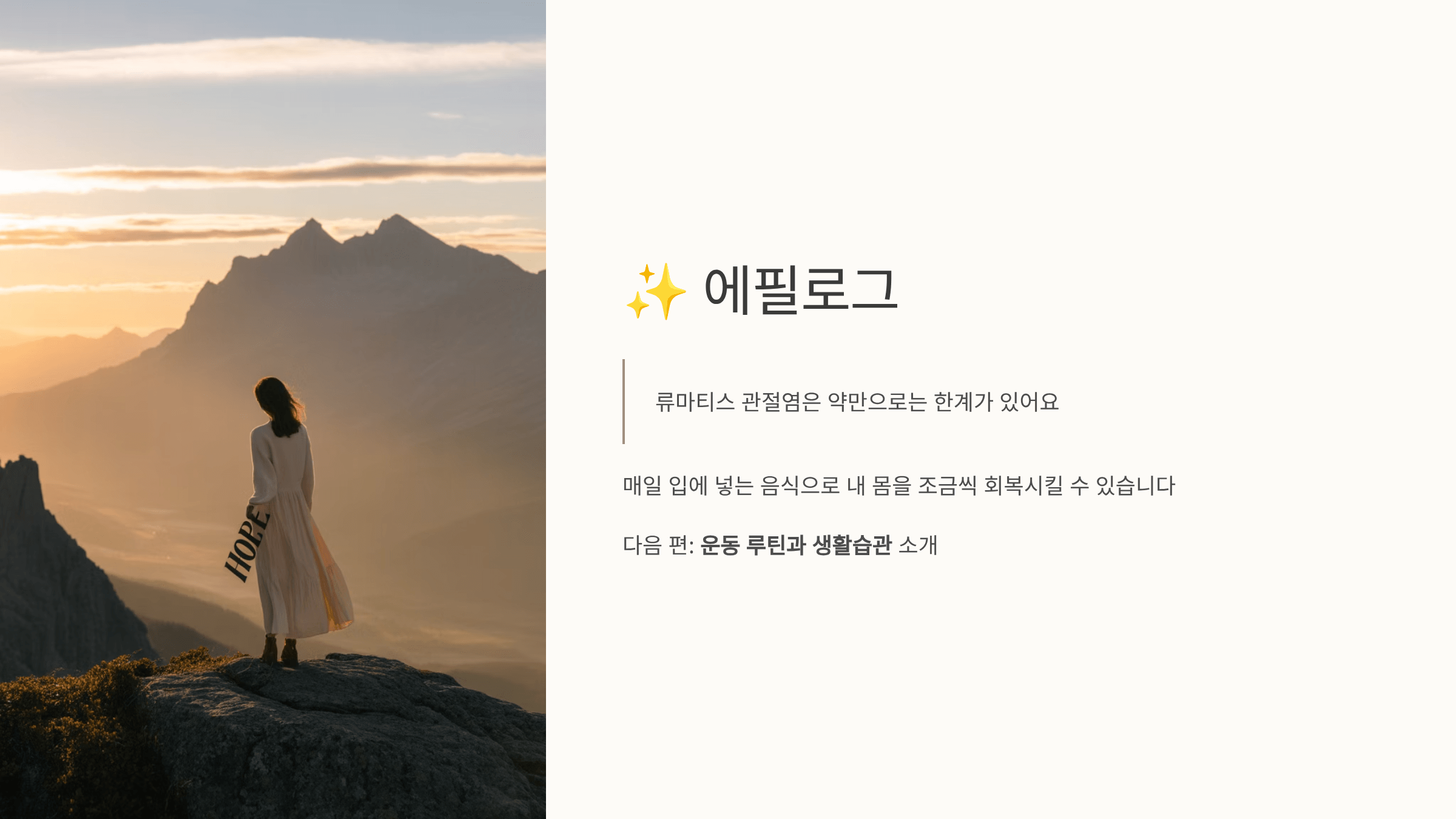 저는 이 글을 통해 ‘식이요법’이라는 표현이 결코 어려운 말이 아니란 걸 전하고 싶었어요. 류마티스 관절염은 약만으로는 한계가 있어요. 우리 스스로 매일 입에 넣는 음식으로 내 몸을 조금씩 회복시킬 수 있다는 걸 꼭 느껴보셨으면 해요.