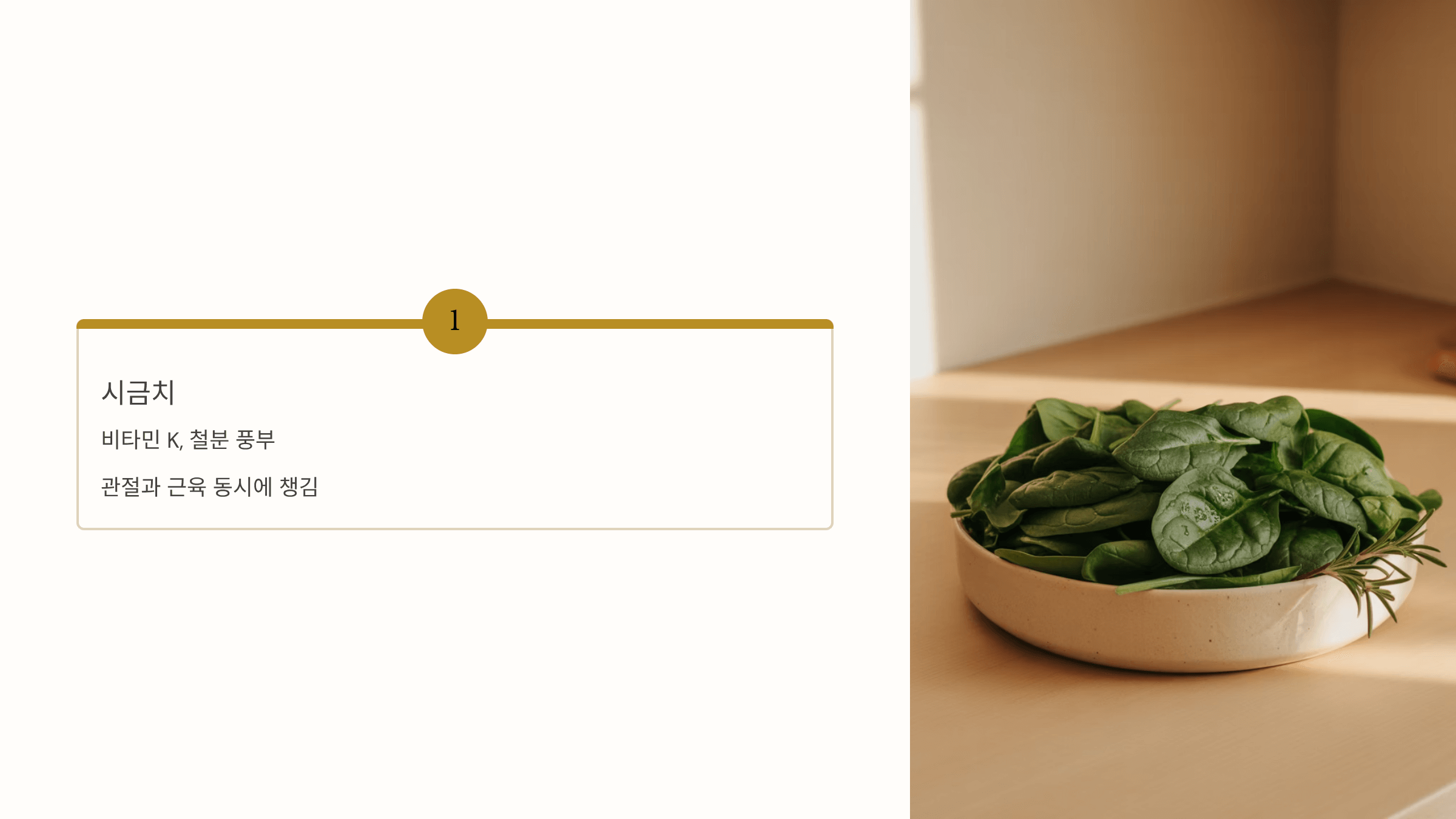 비타민 K와 철분이 풍부해서 관절과 근육을 동시에 챙길 수 있어요. 시금치된장국은 제 최애 레시피 중 하나랍니다.