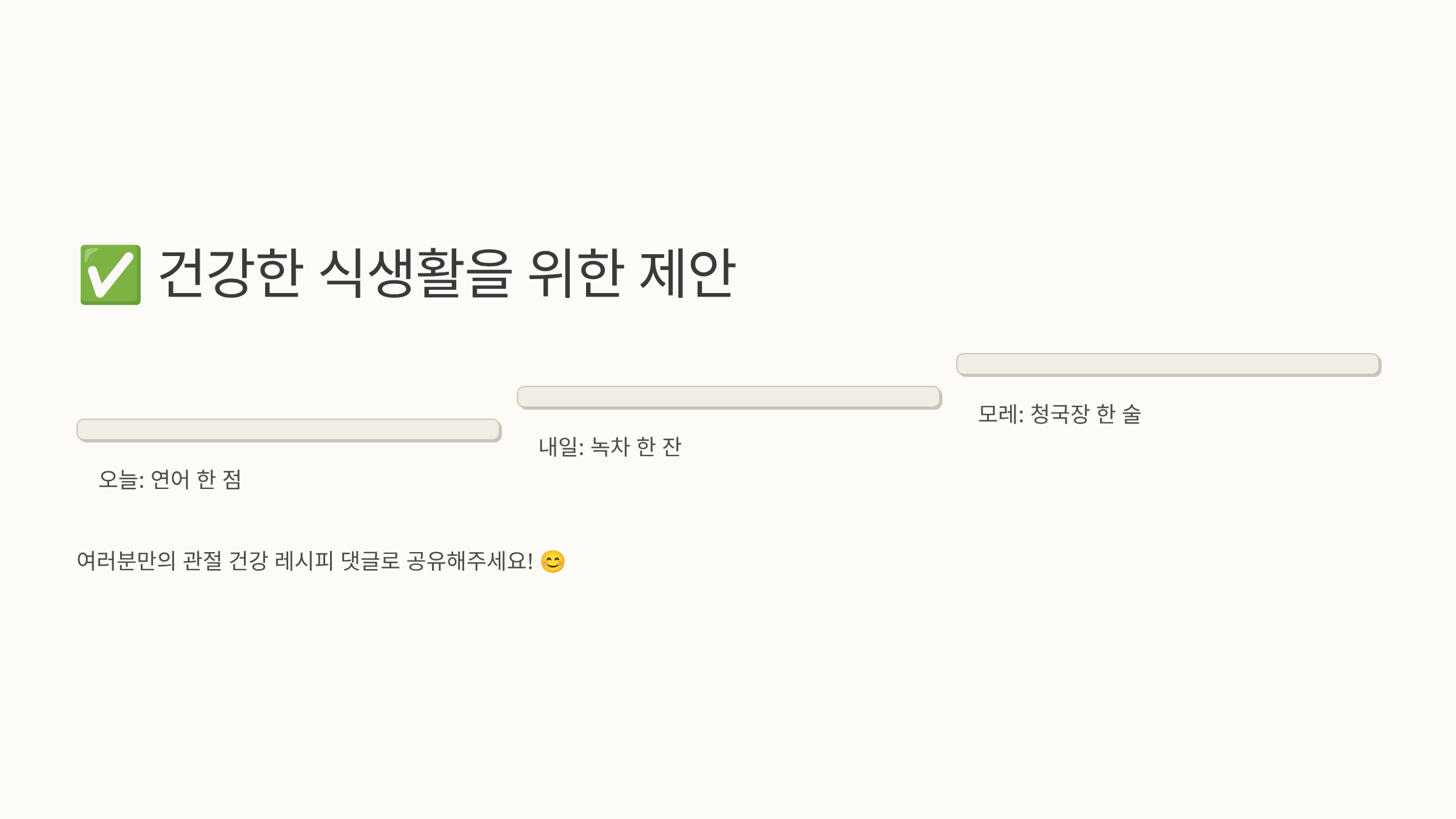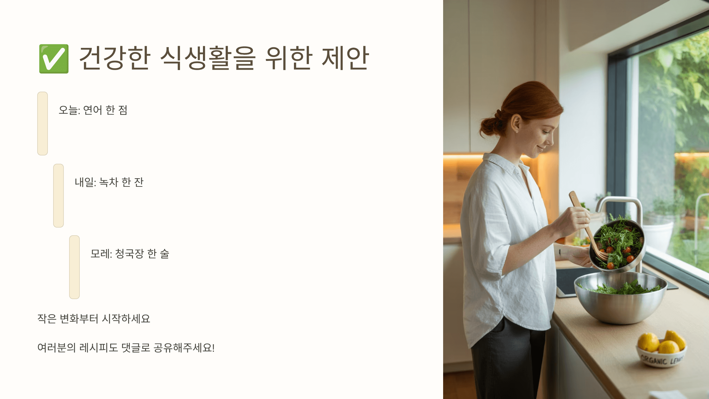 여러분도 매일 식단 속에 작은 변화부터 시작해보세요. 오늘 연어 한 점, 내일 녹차 한 잔, 모레 청국장 한 술로도 충분합니다. 혹시 여러분만의 관절 건강 레시피가 있다면, 댓글로 함께 나눠주세요! 서로의 경험이 큰 도움이 될 수 있어요 😊
