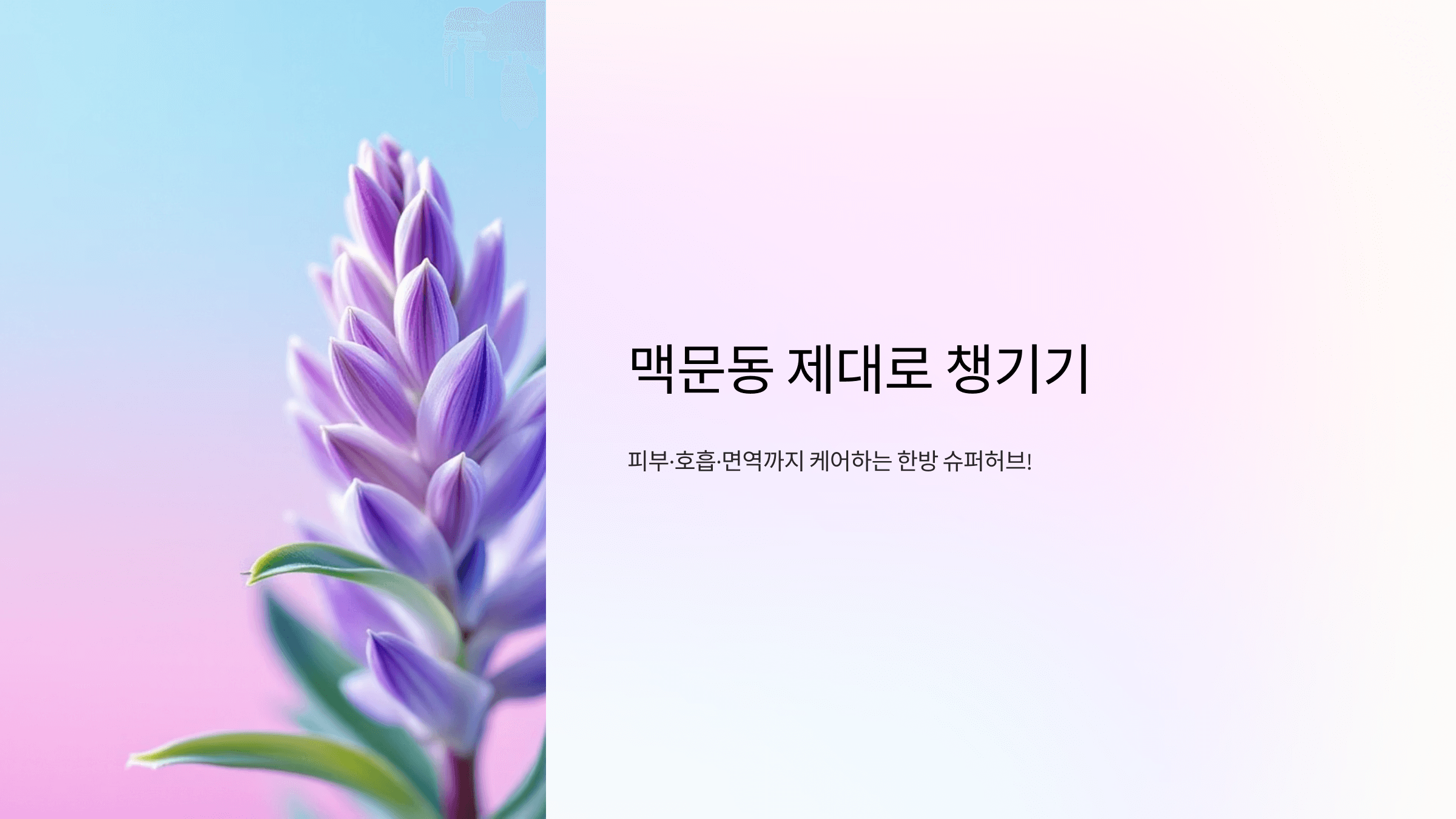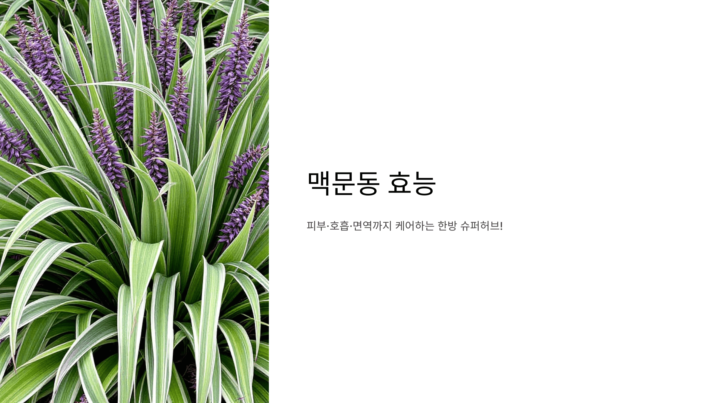 맥문동은 우리 몸의 피부, 호흡, 면역, 스트레스 관리까지 챙겨주는 진짜 슈퍼허브입니다.