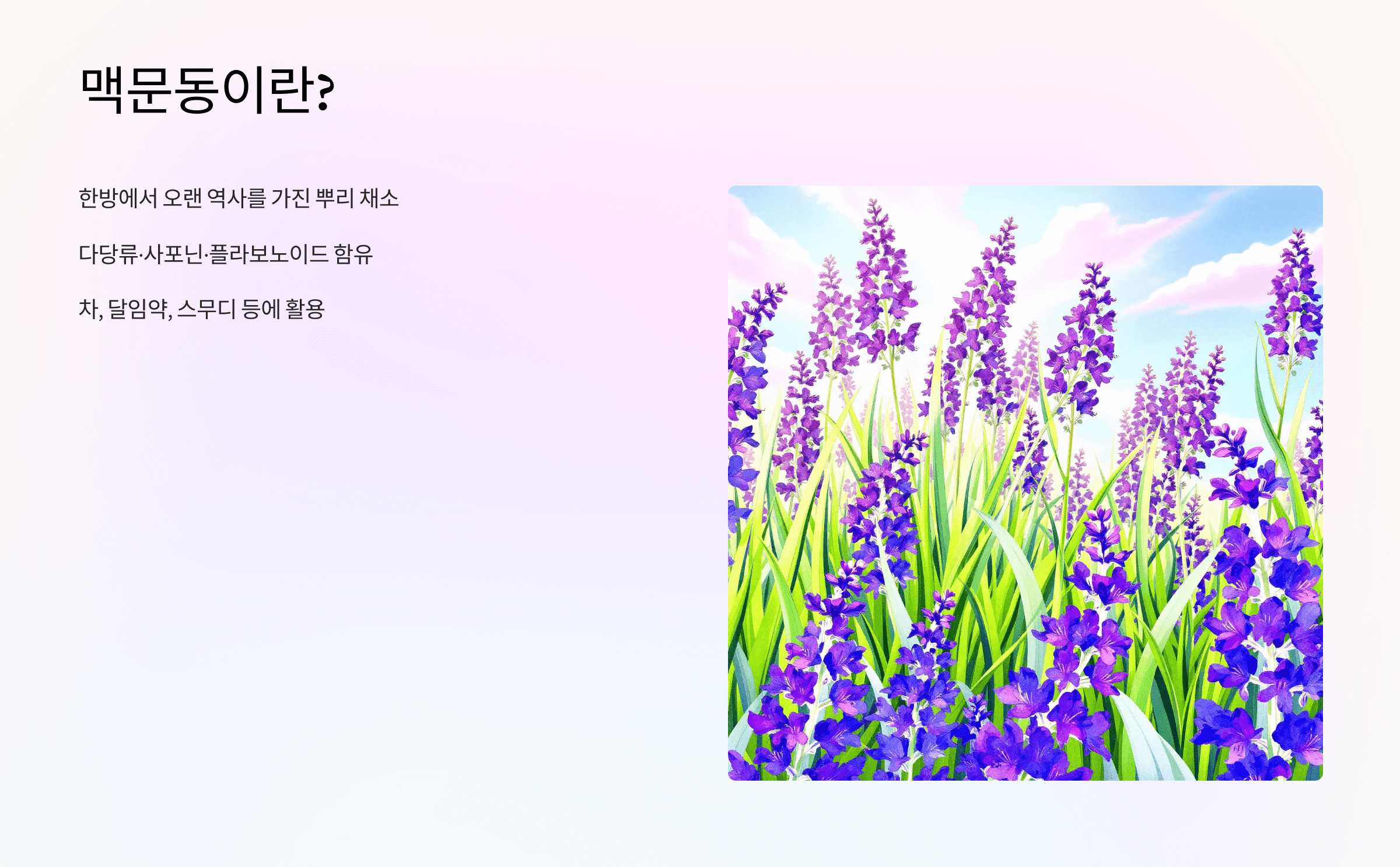 맥문동은 오랜 역사를 거쳐 피부·호흡·면역 등 다방면으로 인정받은 허브입니다. - 작지만 강력한 자연 영양제