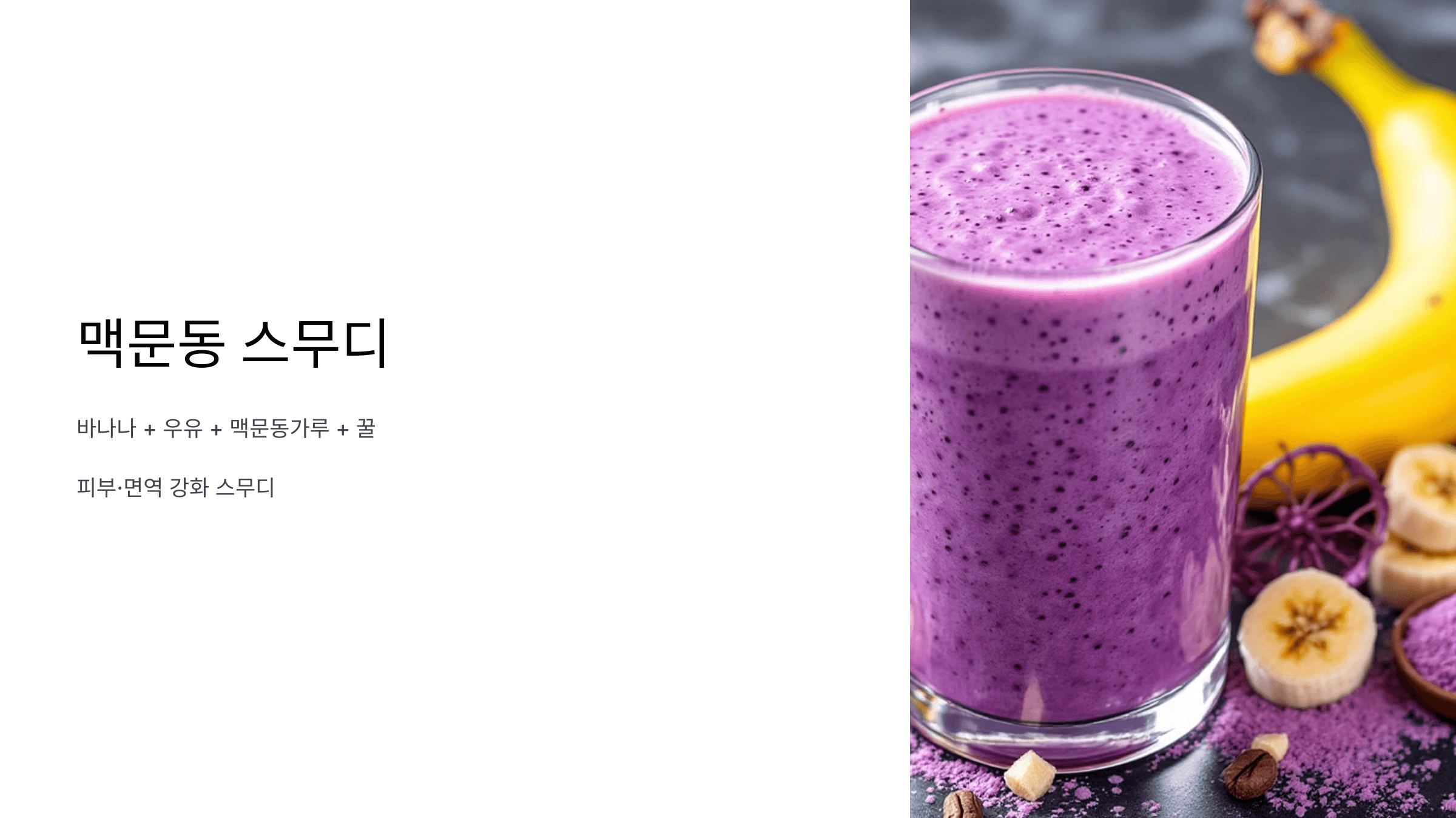 맥문동은 차, 달임약, 스무디 등에 활용되며 피부·호흡기·면역 건강에 효과적인 전통 식재료입니다.