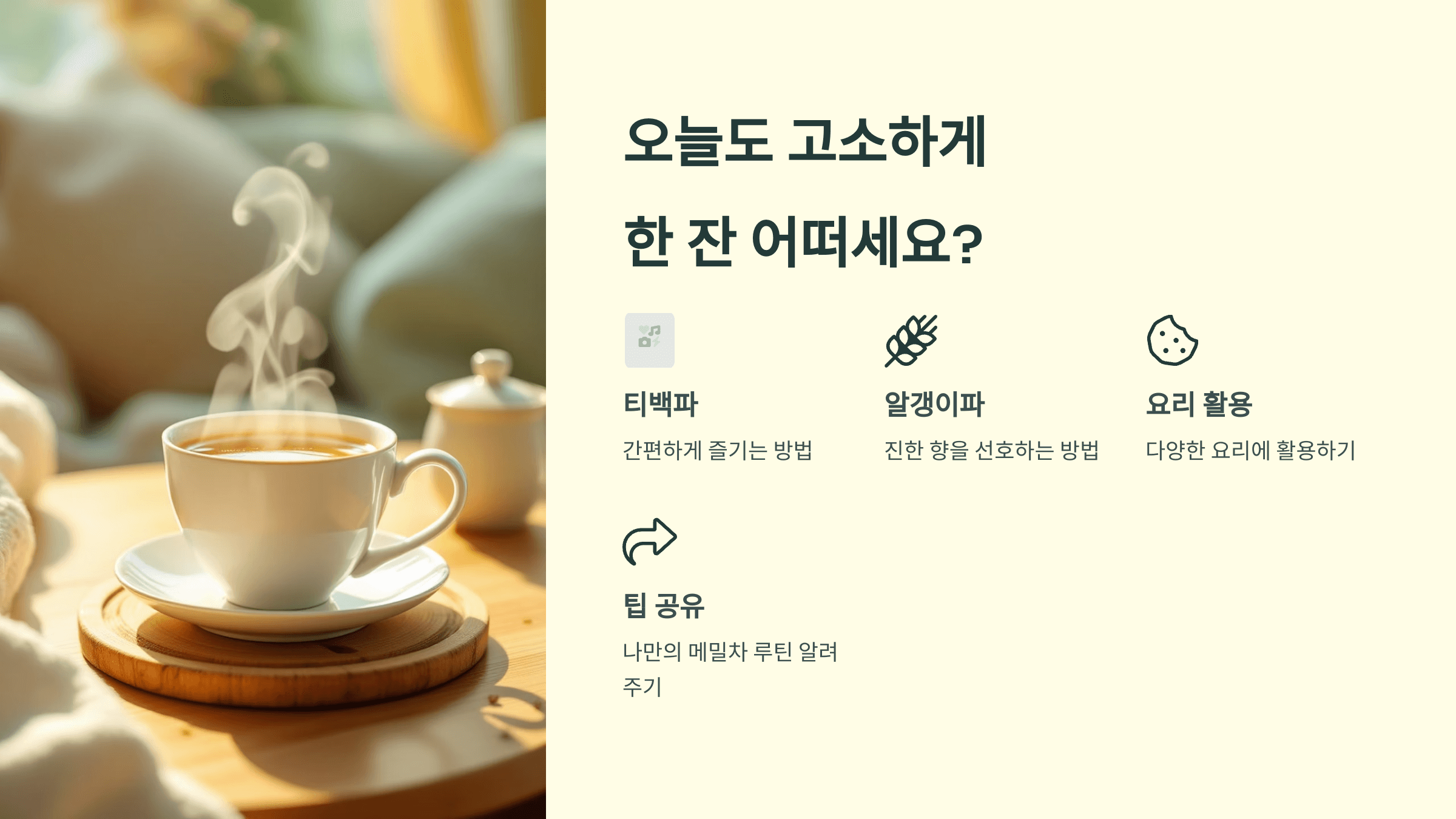 저는 커피 대신 메밀차를 마시면서 속이 편해지고 삶의 리듬이 많이 달라졌어요. 매일 마시는 물에 조금의 정성을 담는 것만으로도 건강해질 수 있다는 걸 느끼고 있답니다.