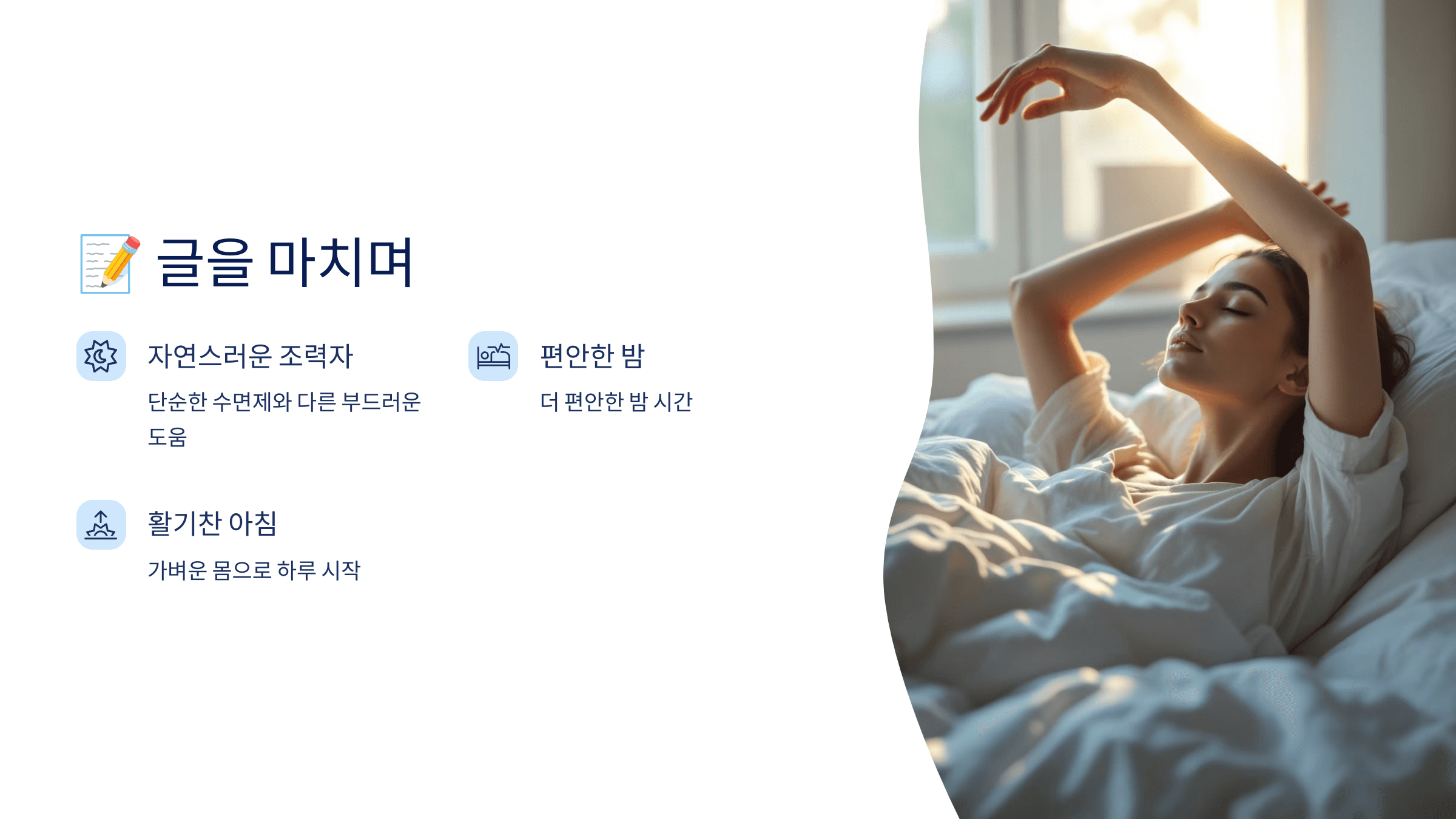 저는 멜라토닌과 함께 밤을 더 편안하게 보내고, 낮엔 훨씬 가벼운 몸으로 하루를 시작할 수 있었어요.